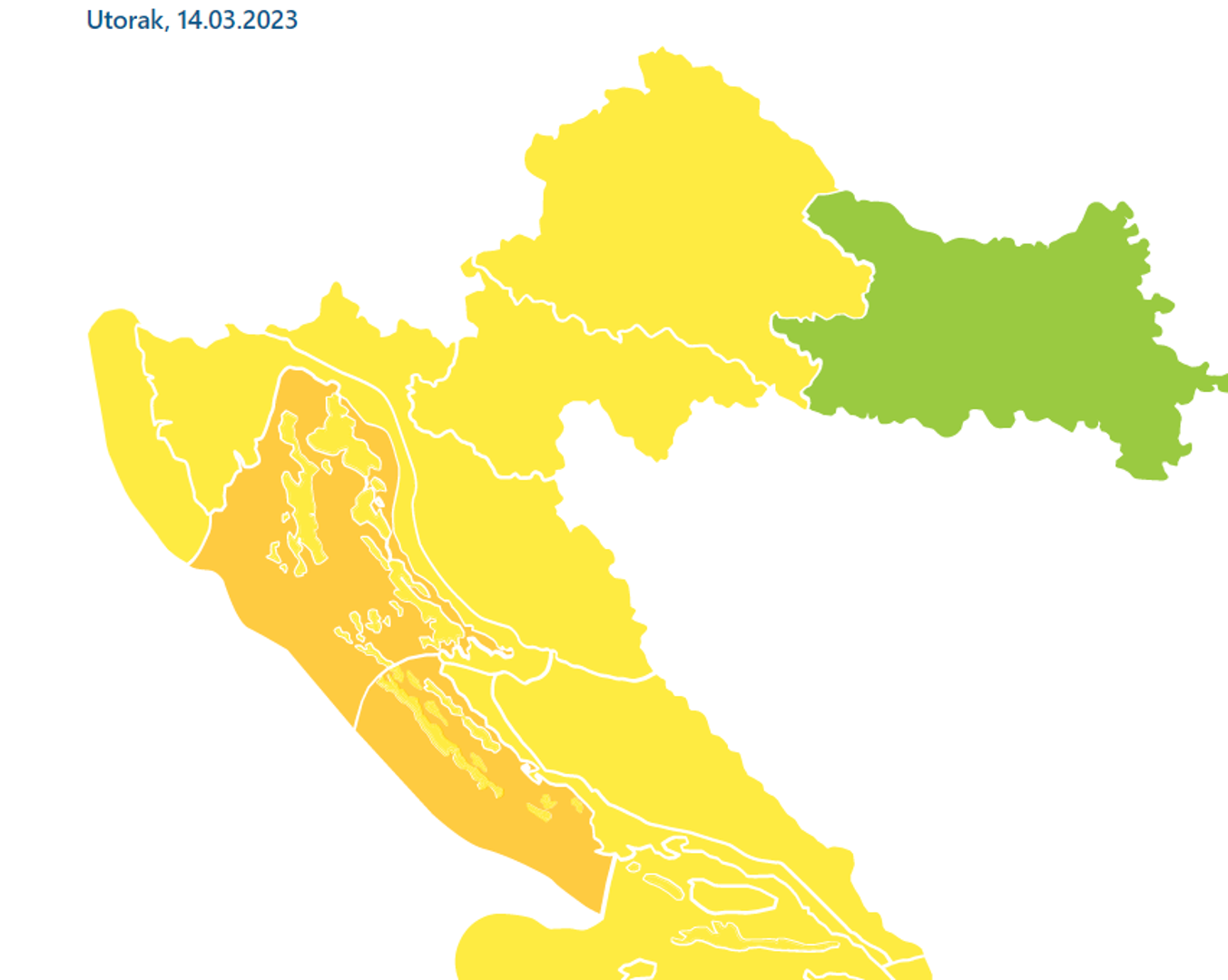 DHMZ javlja da će u utorak biti retežno oblačno i vjetrovito. Povremeno kiša, u Dalmaciji i pljuskovi i grmljavina, a u gorju može biti susnježice i snijega. Od sredine dana postupan prestanak oborina te razvedravanje sa zapada. Vjetar umjeren do jak, na udare osobito u gorju i olujan sjeverni i sjeveroistočni. Na Jadranu će puhati jaka, na udare olujna bura i sjeverni vjetar, na južnom dijelu ujutro još jako i olujno jugo. Najniža jutarnja temperatura između 3 i 8, na Jadranu od 7 do 11, a najviša dnevna između 5 i 10, na Jadranu od 11 do 14 °C.