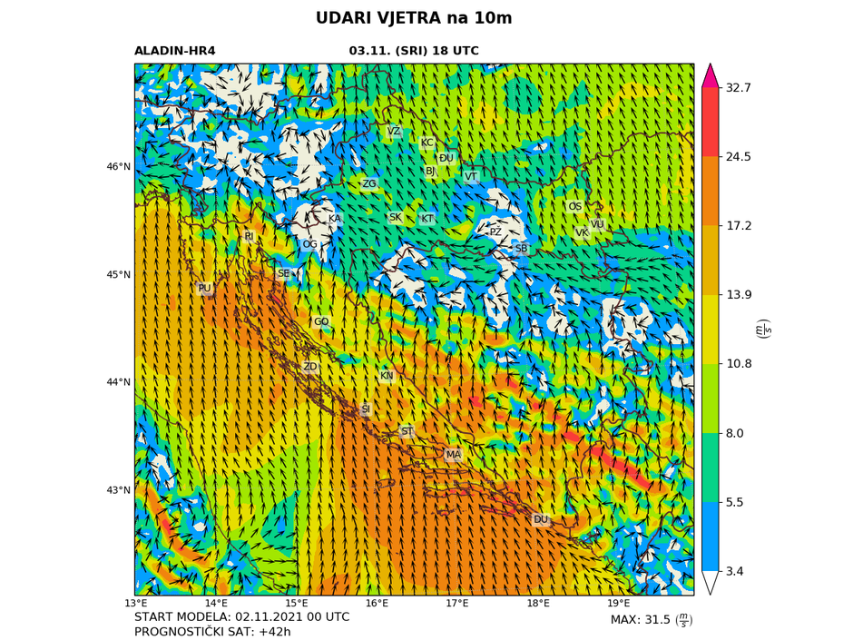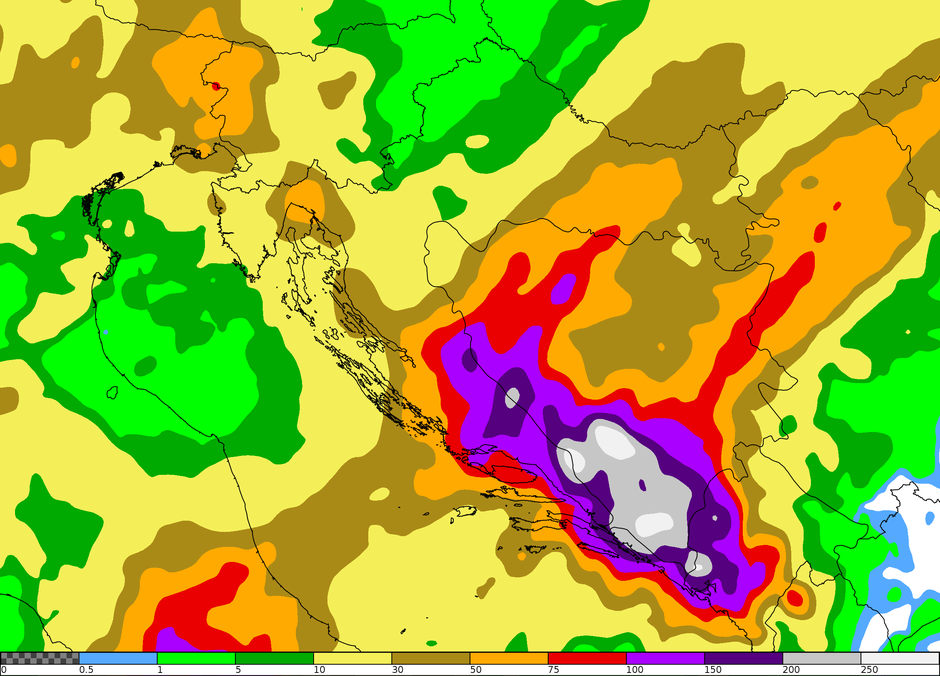 Velike akumulirane količine kiše u razdoblju od srijede do petka (3. 11. – 5. 11. 2021.) predviđaju se na Jadranu i predjelima uz Jadran te u istočnoj Hrvatskoj. Najobilnije oborine, uz vrlo vjerojatno akumulirane količine veće od 100 mm, izgledne su u Dalmaciji, osobito u njezinoj unutrašnjosti, te u susjednoj Bosni i Hercegovini, gdje su moguće količine veće od 200 mm. Pritom će oborine povremeno biti praćene grmljavinom i intenzivne u kratkom vremenu, piše u izvješću.
