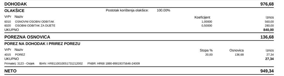 Njegova supruga na svojoj poreznoj kartici ima drugo dijete za koje je povećan osobni odbitak s 331 na 392 eura. Ipak, s obzirom da je riječ o drugom djetetu, ona će dobiti nešto značajnije povećanje jer će si izbiti sav porez s plaće pa će dobiti oko 27 eura više.