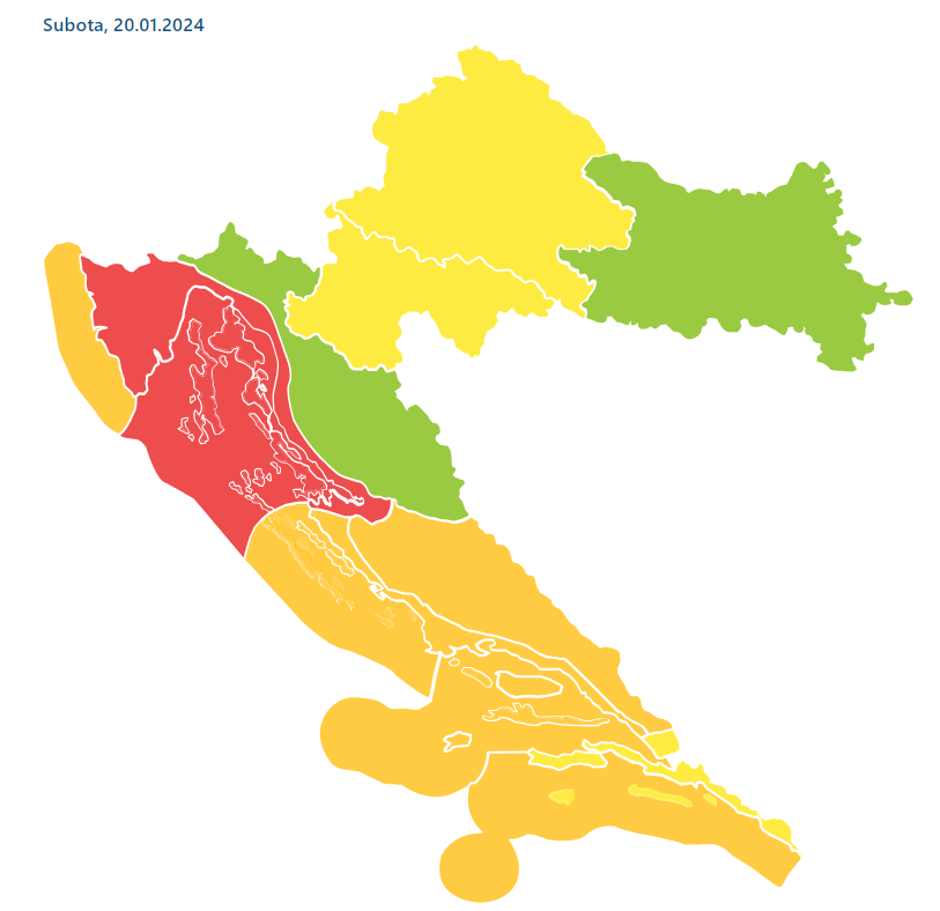 Nakon brojnih upozorenja koja su bila izdana za danas, DHMZ neke je izdao i za sutra, za sve regije osim osječke i gospićke. Crveno upozorenje, koje vrijeme opisuje kao izuzetno opasno, izdano je zbog vjetra za Velebitski kanal, Kvarner i Kvarnerić te riječku regiju.