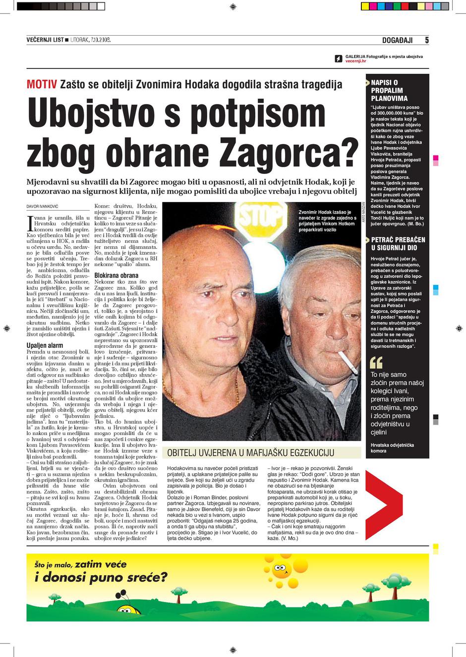 - Tko bi, do Ivanina ubojstva, u Hrvatskoj uopće i mogao pomisliti da će u nas započeti i ovakve egzekucije. Ima li ubojstvo Ivane Hodak izravne veze s tonama tajni koje prekrivaju slučaj Zagorec, to je znak da je ovo društvo suočeno s nekim beskrupuloznim, okrutnim igračima. Ovim ubojstvom oni su destabilizirali obranu Zagorca. Odvjetnik Hodak savjetovao je Zagorcu da se brani šutnjom. Zasad. Pitanje je, hoće li, shrvan od boli, uopće i moći nastaviti posao. Ili će, naprotiv naći snage da pronađe motiv i ubojice svoje jedinice? - pisao je tada Večernji list.