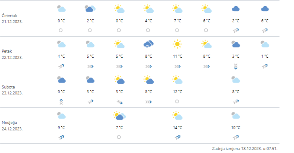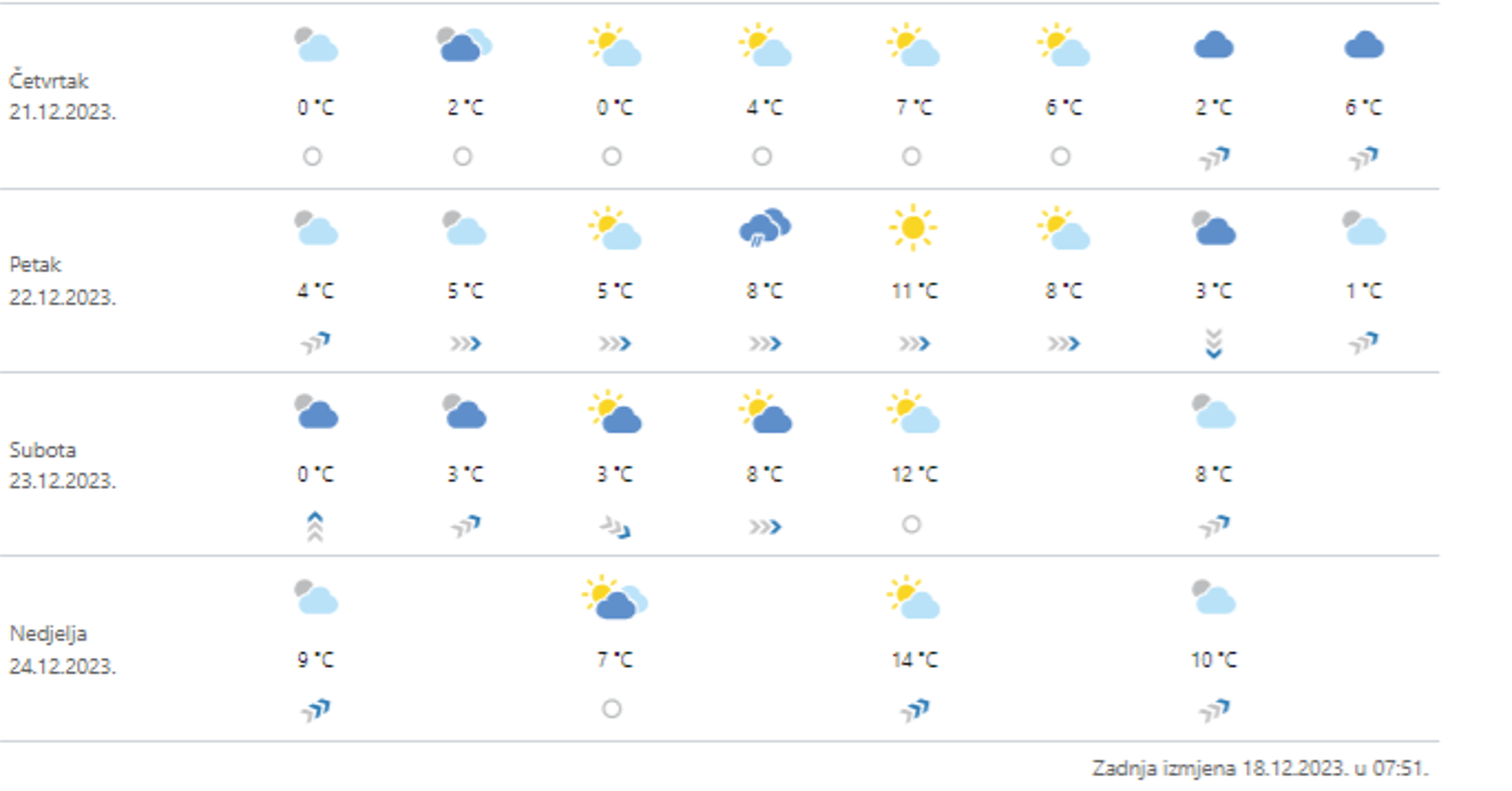 Na stranicama DHMZ-a metogram pokazuje vrijeme za idućih sedam dana. Stiže nam toplije vrijeme. U Zagrebu 7 stupnjeva u četvrtak, u petak 11, subota 12, a na Badnjak čak 14 stupnjeva, što će sigurno ražalostiti one koji su se veselili eventualnom snijegu na Božić.