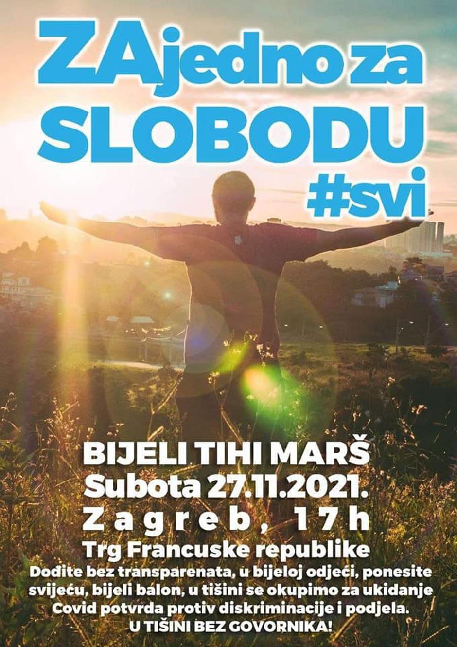 Pod geslom "Zajedno za slobodu" najavljen je za sutra novi Bijeli tihi marš u Zagrebu. Prosvjedni marš protiv Covid potvrda započet će u 17 sati na Trgu Francuske Republike, ali organizatori ovaj put najavljuju da će se razlikovati u odnosu na veliki subotnji prosvjed na Trgu bana Jelačića.
