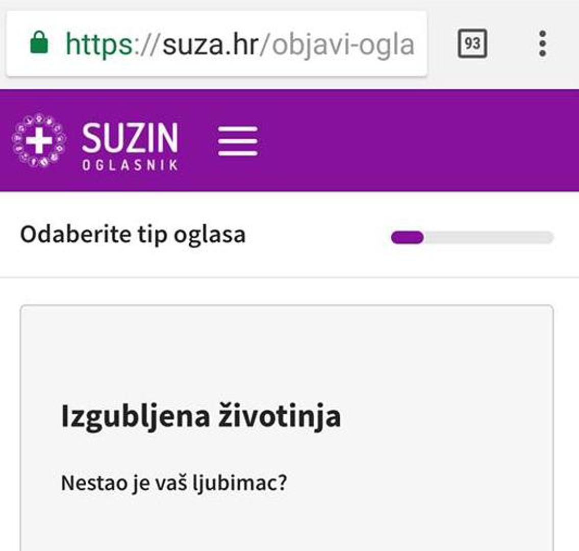 Nakon gašenja Suzinog Infocentra u kojem su se 11 godina primali pozivi za izgubljene, pronađene, ranjene i zlostavljane životinje SUZA je, zajedno sa softwerskim tvrtkama Undabot i Trikoder, pokrenula novi projekt nazvan Suzin oglasnik. Prednost mu je, prije svega, što ne morate kontaktirati administratore Facebook stranica, niti operatere na telefonima. Sve možete napraviti sami, uz pomoć mobitela, a jedino se pri prvom ulasku u Suzin oglasnik na adresi https://suza.hr morate registrirati svojom mail adresom, nakon čega ćete dobiti i potvrdu o registraciji. Oglasnik je namijenjen korisnicima iz cijele Hrvatske pa oglas možete postaviti bez obzira u kojem dijelu Hrvatske živite ili ste se našli.