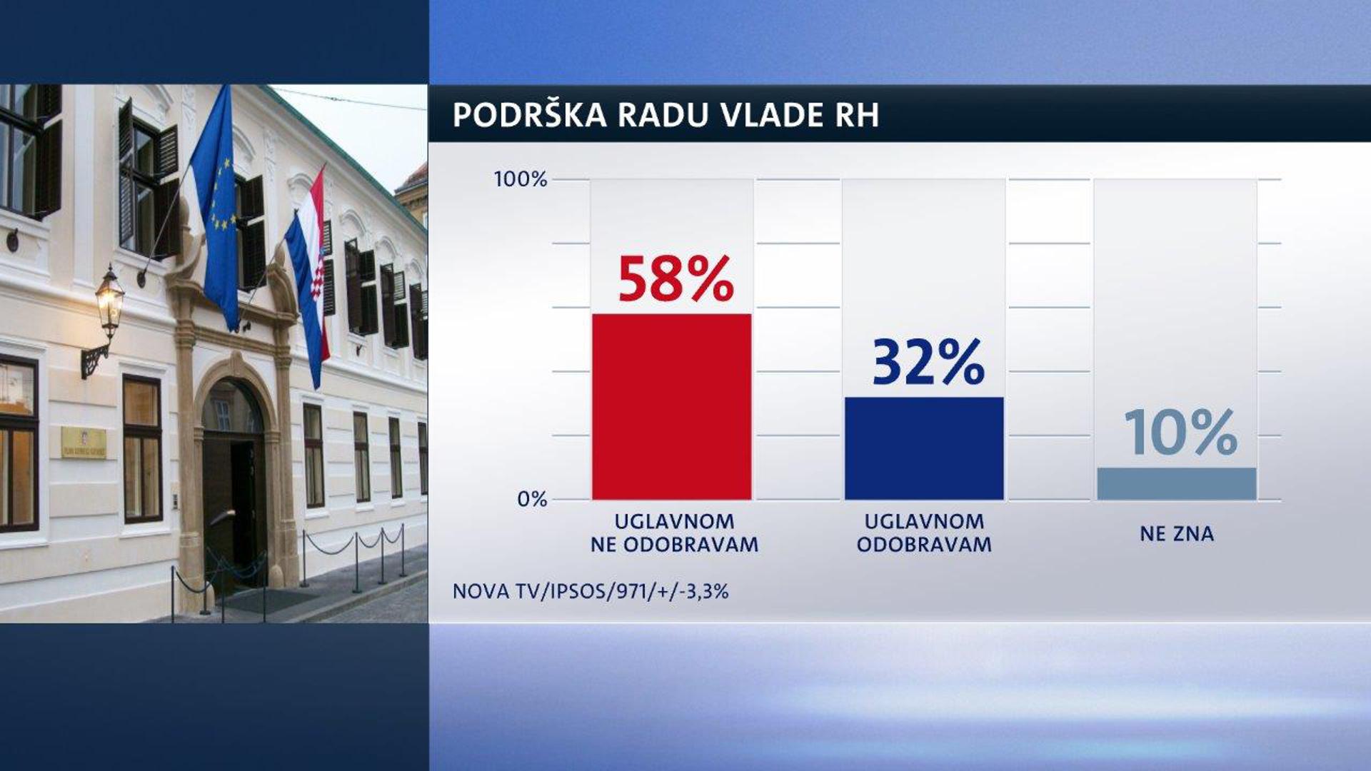 Vladinu politiku i dalje većina građana ne odobrava, točnije, njih 58 posto. Već treći mjesec taj broj lagano, ali zamjetno raste. Istodobno pada, ali još uvijek ne dramatično, broj onih koji odobravaju Vladinu politiku. Sada ih je 32 posto. Ne zna njih 10 posto. Zato iz mjeseca u mjesec raste broj građana koji vjeruju da će Vlada odraditi mandat do kraja i trenutačno ih je 67 posto, a da neće, misli pak njih 23 posto. Ne zna 10 posto ispitanika.