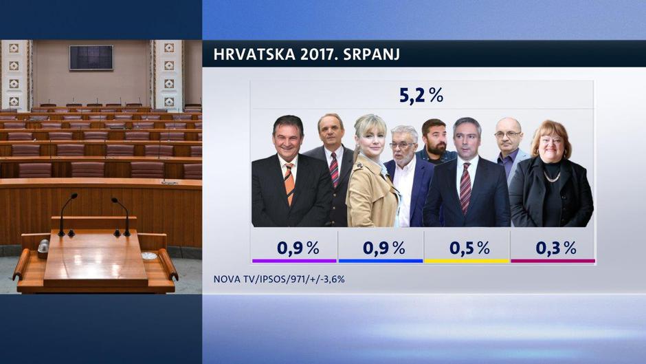Narodna strana Radimira Čačića ima 0,9 posto, Neovisni za Hrvatsku Brune Esih 0,9 posto, HDSSB uživa potporu od 0,7 posto, Hrvatska demokršćanska stranka također može računati na potporu od 0,7 posto birača, Nova ljevica 0,6 posto, HSLS, dio vladajuće koalicije, ima potporu od 0,5 posto, SNAGA uživa potporu od 0,4 posto a GLAS, koji vodi Anka Mrak Taritaš, u prvom testiranju birača uživa potporu od 0,3 posto, HRAST ima 0,2 posto, a neka druga stranka 1 posto. Neodlučnih birača je 8,4 posto.