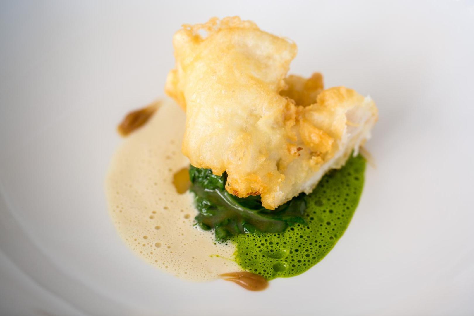 – Raža je nešto obično, ali ako je u hrskavoj tempuri s blitvom, konfitiranim krumpirom, češnjakom i našom verzijom beurre blanc umaka, onda može biti i posebna – počinje pažljivo slažući na tanjur naše prvo jelo uz pomoć svojih sous chefova Roberta Boštjančića i Marija Štokića. Slijedi kopun. Joj, prvo je pomislio autor koji nije osobit ljubitelj jela od uškopljenog pijetla.