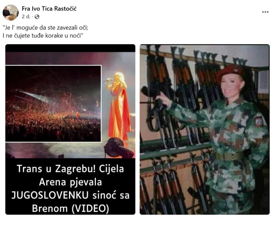Objavio je fotografiju Lepe Brene u vojnoj odori kraj oružja te jednu s koncerta na kojoj piše "Trans u Zagrebu! Cijela Arena pjevala Jugoslovenku s Brenom".