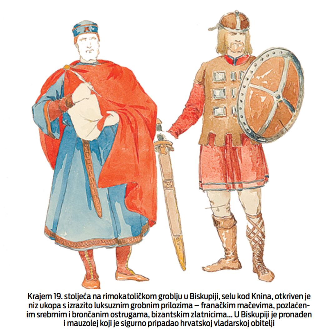 No, ako su se negdje mogli očekivati ovakvi nalazi, onda je jedno od tih mjesta bila i Biskupija, selo u kojem se nalazio vladarski posjed, mjesto gdje je u prvoj polovini 9. stoljeća podignuta velika bazilika koja je očito služila kao mauzolej rane hrvatske vladarske obitelji te gdje je od 11. stoljeća svoje sjedište imao hrvatski biskup (episcopus Chroatensis). Biskupijski nalazi toliko su važni da se na europskoj razini cijeli jedan arheološki horizont kraja 8. i početka 9. stoljeća naziva Biskupija-Crkvina. U najraskošnijem sarkofagu s tog lokaliteta, tzv. sarkofagu s hipokampima (starogrčko mitološko stvorenje prikazano kao morski konj s konjskim trupom i ribljim repom umjesto stražnjeg dijela trupa) pronađen je skelet pokojnika s luksuznim grobnim prilozima – pozlaćene franačke ostruge, privjesak od japisa, bizantski zlatnik, zlatom obrubljena svila koja se na žalost u doticaju s atmosferilijama i ljudskom rukom raspala.