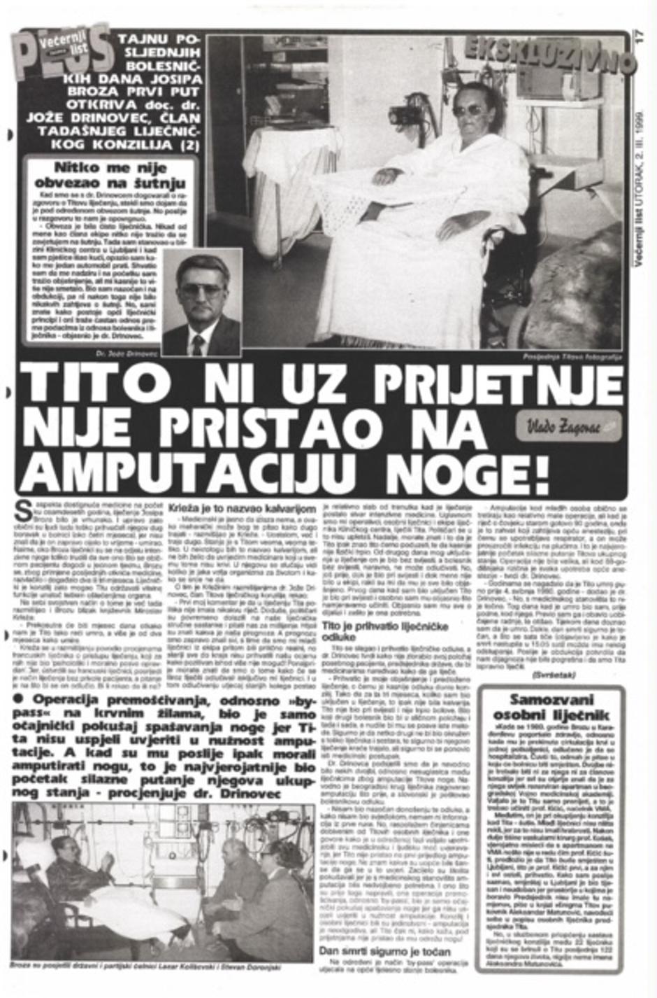 Kako je Tito reagirao kada su mu rekli da mu moraju amputirati nogu? Da li je zahtijevao poseban tretman? Da li je u bolnici bio predsjednik koji naređuje, ili pacijent koji se slaže s odlukama liječnika? Je li politika umiješala prste u liječenje prvog čovjeka bivše Jugoslavije? Da li je Josip Broz doista umro 4. svibnja, 1980. godine ili mnogo ranije? Odgovore na ta i niz drugih pitanja, saznali su novinari Večernjeg, kojima je, gotovo dva desetljeća nakon Titove smrti, tajne posljednjih dana njegova života otkrio doc. dr. Jože Drinovec, jedan od dvadesetdvojice liječnika koji su brinuli o Titu posljednjih 122 dana njegova života.