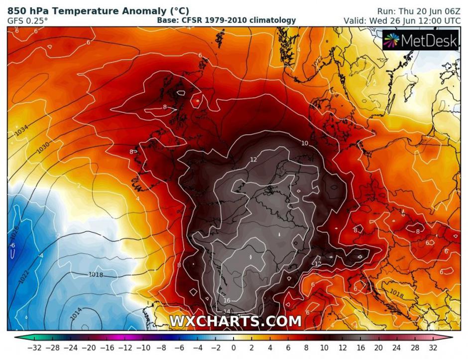 Najnovije smjernice pokazuju da će početkom idućeg tjedna stići intenzivni toplinski val s temperaturama od 16 do 20 Celzijevih stupnjeva višima od prosjeka pri tlaku zraka od 850 HPa. To bi moglo dovesti do visokih popodnevnih temperatura u Europi. Tako bi se primjerice u južnoj Engleskoj živa na termometru mogla penjati na 30 do 35 stupnjeva, dok bi u djelovima Francuske, Beneluksa i Njemačke od utorka do subote trebalo biti između 36 i 40 Celzija, javlja Severe Weather Europe.