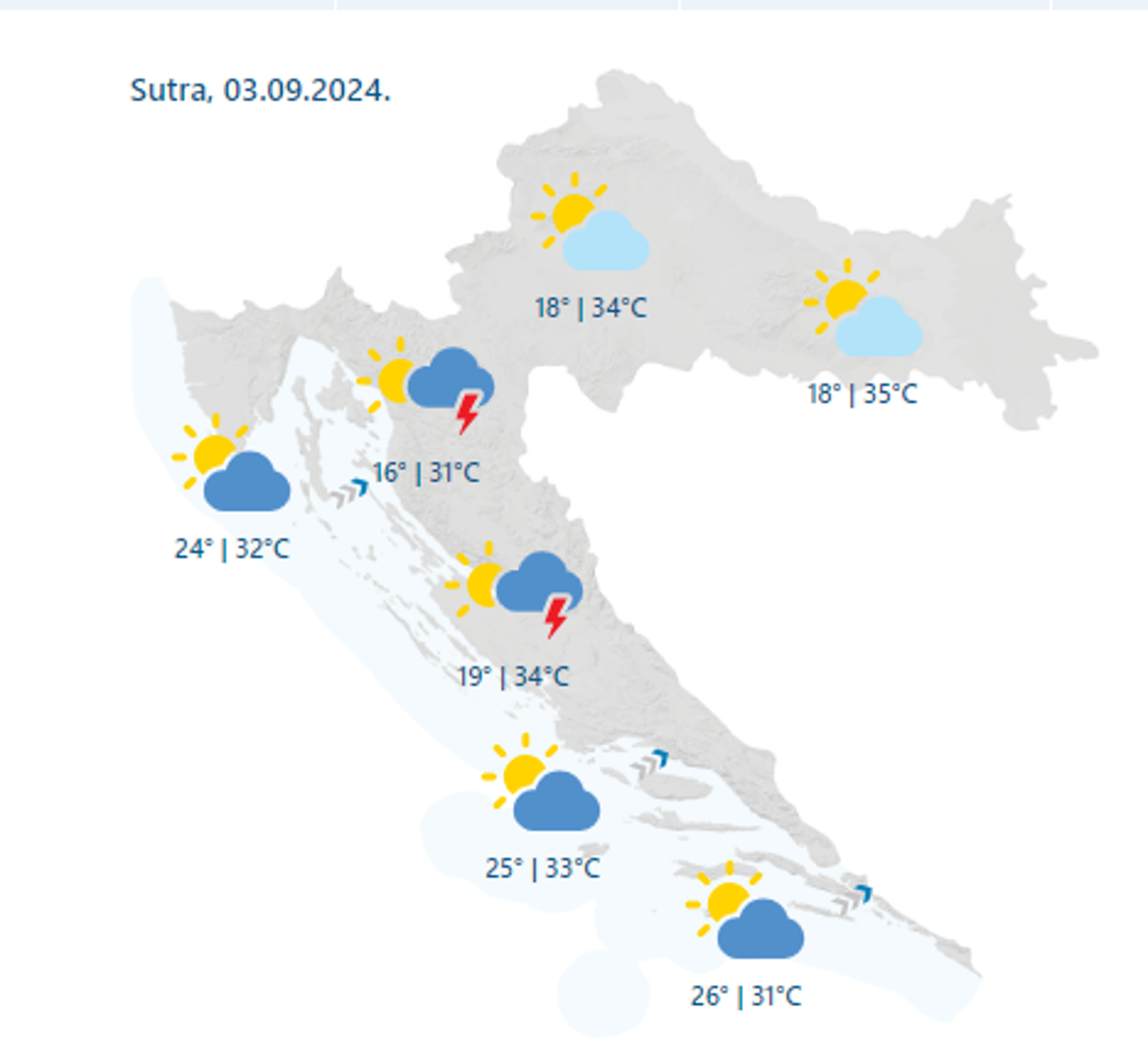 Na zapadu Hrvatske povremeno će puhati umjeren jugozapadni vjetar, dok će na sjevernom Jadranu prolazno zapuhati sjeverozapadnjak. Iako će prevladavati sunčano vrijeme, u Gorskoj Hrvatskoj i unutrašnjosti Istre vrlo su vjerojatni popodnevni pljuskovi s grmljavinom, ponegdje i izraženiji. Najviše dnevne temperature kretat će se između 28 °C u gorju i 33 °C na obali, uz noćne temperature koje i dalje upozoravaju na nastavak toplinskog vala.