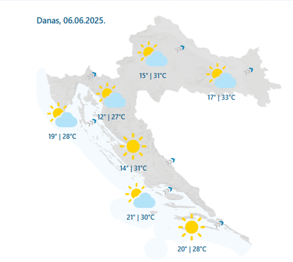 Nad Sredozemljem i velikim dijelom južne Europe i dalje se zadržava vrlo topla zračna masa, dok je svježiji zrak zapeo na sjevernoj strani Alpa. Takav raspored sprečava prodor hladnijih fronti dublje prema jugu, no uz povremeno slabljenje tog „obrambenog zida“ i naši krajevi mogu nakratko osjetiti nestabilnosti. Tako će biti i ovoga vikenda – do samog kraja tjedna uglavnom sunčano, vrlo toplo i često vruće, ali u nedjelju navečer stiže nagla promjena vremena.
