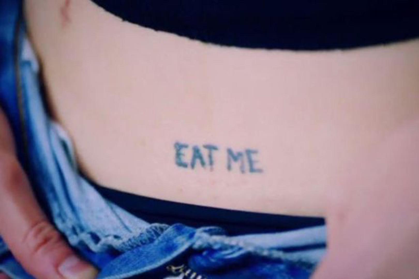očito netko tko ne zna engleski jezik doslovno prevodi "eat me".Najluđa tetovaža za nepismenog novinara. u ovom slučaju to znači "poliži me" (da ne budem doslovan)...a čisto sumnjam da joj je ta tetovaža uništila seksualni život.