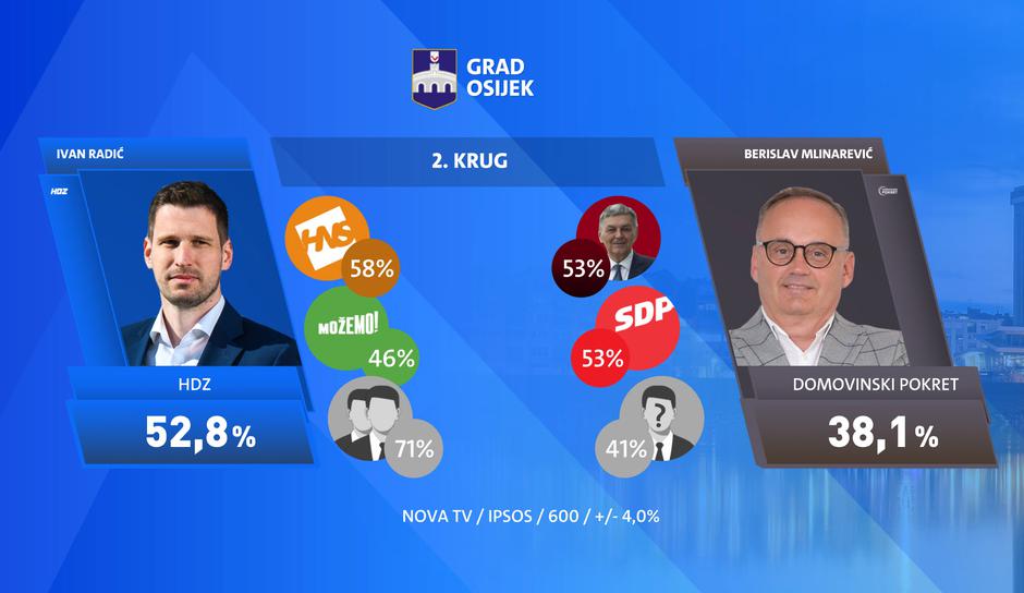 HDZ-ovac Ivan Radić u Osijeku trenutačno može računati na potporu 38 posto birača. Daleko iza njega je Berislav Mlinarević s potporom od 19,2 posto, slijedi SDP-ov kandidat Goran Kušec s potporom od 16,2 posto, šansu da uđe u drugi krug ima i Vladimir Šišljagić, koji sada može računati na potporu 13,1 posto birača.