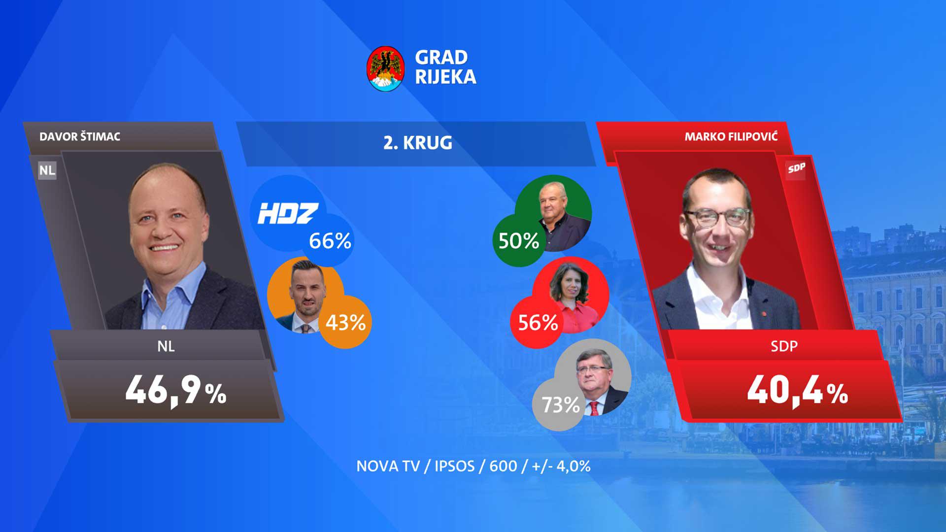 Filipović u Rijeci osvaja 22,8, a Štimac 21,2 posto potpore. Slijedi Nikola Ivaniš s potporom od 14,4 posto. HDZ-ov Josip Ostrogović može računati na 11,5 posto potpore, a Marin Miletić iz MOSTA trenutačno ime potporu od 9,4 posto. Nebojšu Zelića podupire 3,5 posto, a Anu Blečić Jelenović 3 posto birača. Katarina Peović u Rijeci može dobiti 2,9 posto. Vedran Vivoda je na 2 posto, Hrvoje Burić na 1,8 posto, a Antun Antunović na 1,2 posto. Neodlučnih je 6,3 posto.