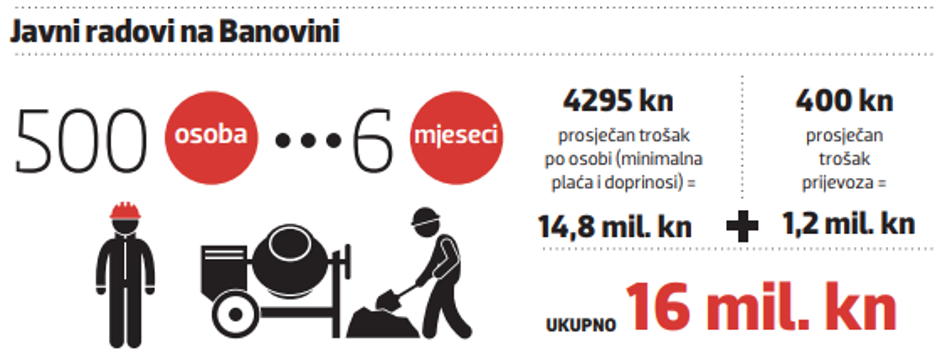 Radni odnos na taj način traje šest mjeseci, a može se produljiti i na devet mjeseci. Za javnim su radovima najčešće posezale manje lokalne jedinice u Slavoniji i kontinentalnom dijelu zemlje, a tek treba vidjeti hoće li vlasti Sisačko-moslavačke županije, ali i lokalno stanovništvo, pokazati interes da se na taj način uključe u obnovu. Većina ljudi zaposlena na javnim radovima angažirana je na raznim komunalnim poslovima. Minimalna bruto plaća od ove godine iznosi 4250 kuna, što je na ruke 3400 kuna neto.