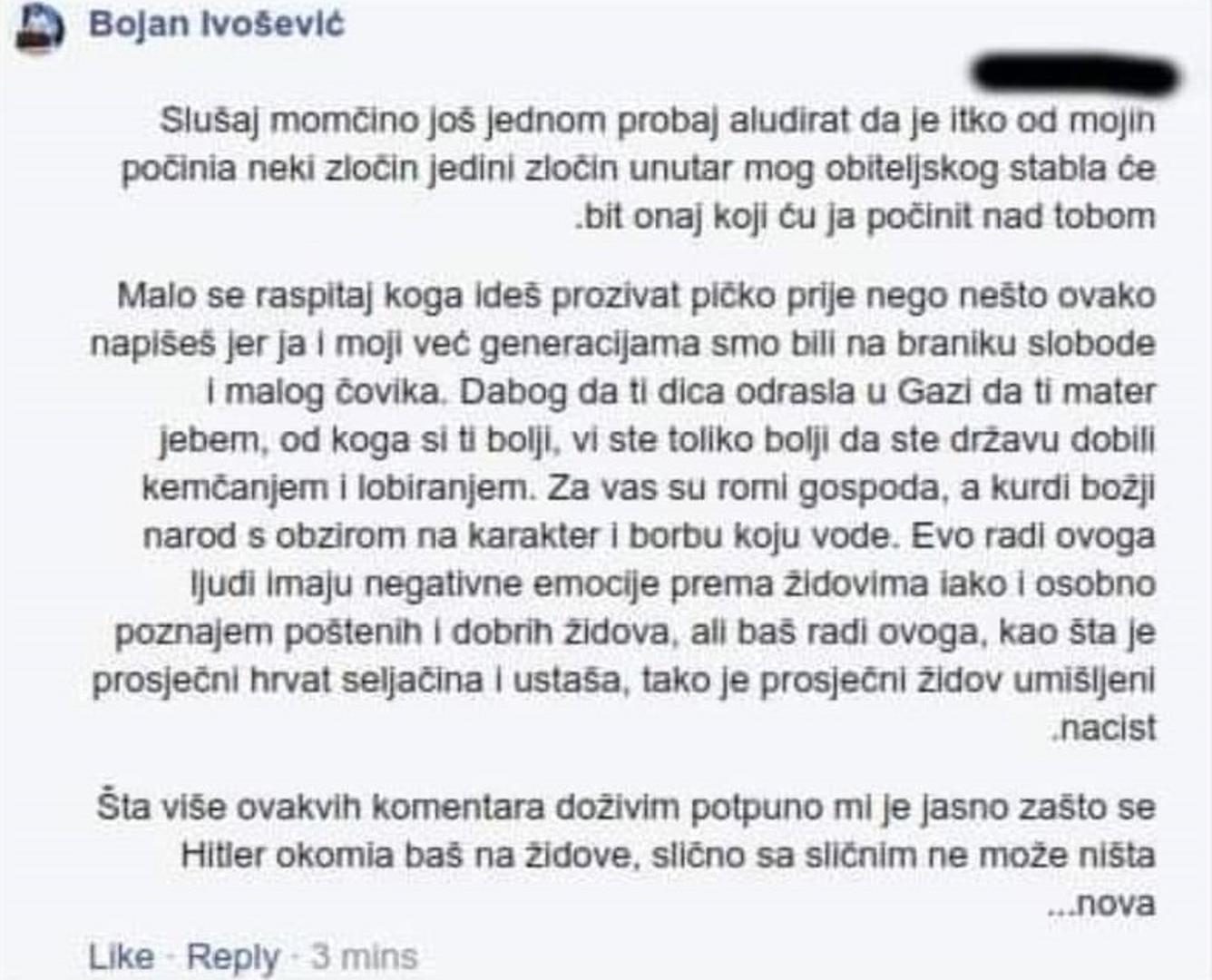 "Slušaj momčino još jednom probaj aludirat da je itko od mojih počinia neki zločin jedini zločin unutar mog obiteljskog stabla će bit onaj koji ću ja počinit nad tobom. Malo se raspitaj koga ideš prozivat pi*ko prije nego nešto ovako napišeš jer ja i moji već generacijama smo bili na braniku slobode i malog čovika. Dabog da ti dica odrasla u Gazi da ti mater je*em, od koga si ti bolji, vi ste toliko bolji da ste državu dobili kmečanjem i lobiranjem. Za vas su Romi gospoda, a Kurdi božji narod s obzirom na karakter i borbu koju vode. Evo radu ovoga ljudi imaju negativne emocije prema židovima iako i osobno poznajem poštenih i dobrih židova, ali baš radi ovoga, kao šta je prosječni Hrvat seljačina i ustaša, tako je prosječni Židov umišljeni nacist. Šta više ovakvih komentara doživim potpuno mi je jasno zašto se Hitler okomia baš na Židove, slično sa sličnim ne može ništa… nova.”