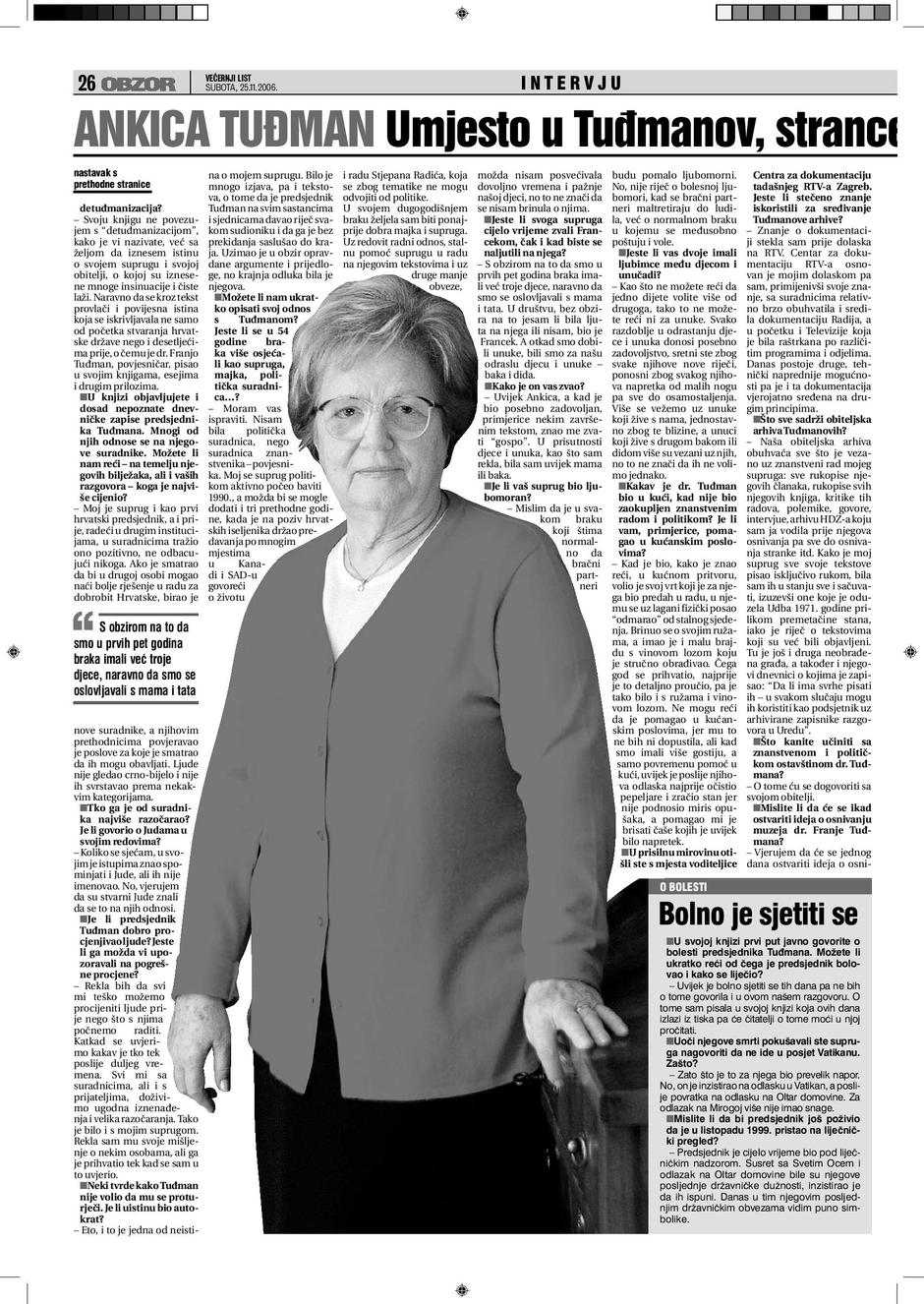 – Svoju knjigu ne povezujem s „detuđmanizacijom“, kako je vi nazivate, već sa željom da iznesem istinu o svojem suprugu i svojoj obitelji, o kojoj su iznesene mnoge insinuacije i čiste laži. Naravno da se kroz tekst provlači i povijesna istina, koja se iskrivljavala ne samo od početka stvaranja hrvatske države nego i desetljećima prije, o čemu je dr. Franjo Tuđman, povjesničar, pisao u svojim knjigama, esejima i drugim prilozima.