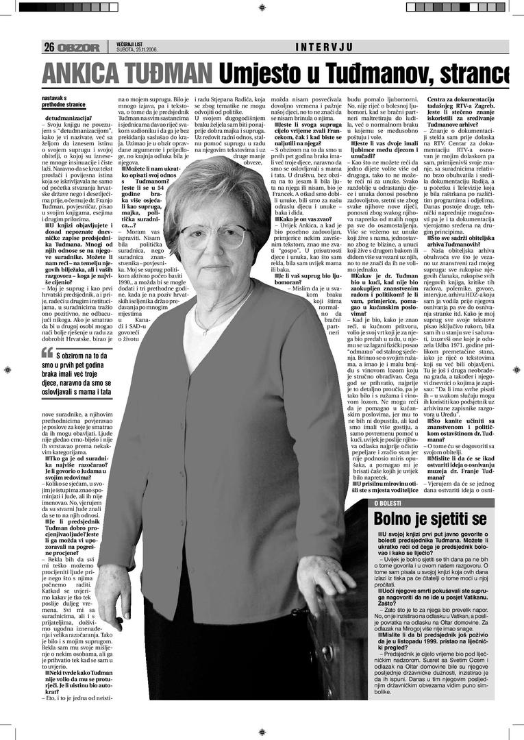 Nekadašnja prva dama Ankica Tuđman rijetko je istupala u javnosti, a i kad bi to činila, njezini istupi u pravilu su se odnosili na obranu lika i djela njezina supruga, prvoga hrvatskog predsjednika Franje Tuđmana. Posljednji veliki intervju dala je našem uredniku Žarku Ivkoviću u studenom 2006. uoči izlaska njezine autobiografije „Moj život s Francekom“. Ta knjiga, nastala sedam godina nakon Tuđmanove smrti, zapravo je bila njezin odgovor na tzv. proces detuđmanizacije, koji je najustrajnije provodio tadašnji predsjednik Republike Stjepan Mesić, a koji je završio haaškim oslobađanjem generala Gotovine i Markača. Intervju, objavljen u studenom 2006. u Večernjem listu, prenosimo u cijelosti.