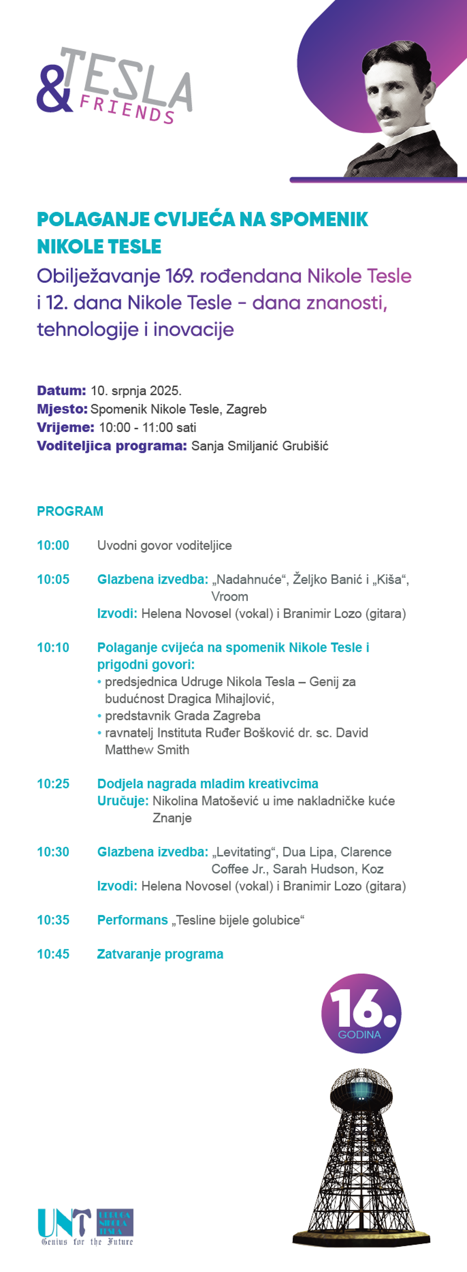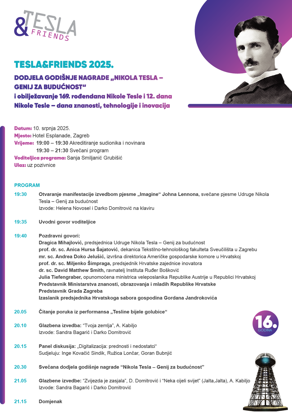 Pozivamo sve zainteresirane da posjete ovogodišnju manifestaciju Tesla&friends i svojim sudjelovanjem doprinesu obilježavanju rođendana čovjeka koji je osvijetlio svijet – Nikole Tesle. Poziv na sva događanja su slobodna osim na program u Hotelu Esplanade uz pozivnice radi ograničenog broja mjesta.