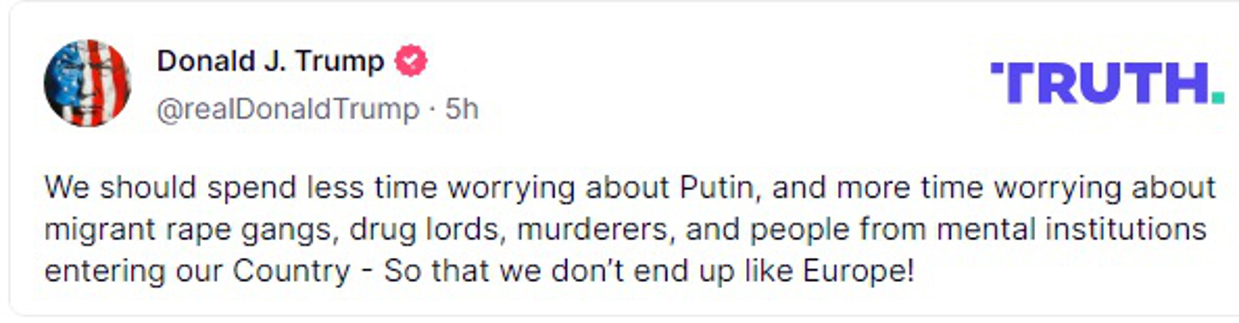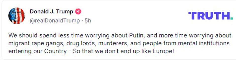 Oglasio se i američki predsjednik kojeg izgleda brinu neke druge stvari iako je Zelenskom predbacio da bi mogao izazvati treći svjetski rat. "Trebali bismo se manje brinuti u vezi s Putinom, a više se brinuti o grupama silovatelja migranata, narkobosovima, ubojicama i ljudima iz mentalnih ustanova koji ulaze u našu zemlju – da ne završimo kao Europa!", poručio je Trump na svojoj društvenoj mreži Truth Social.
