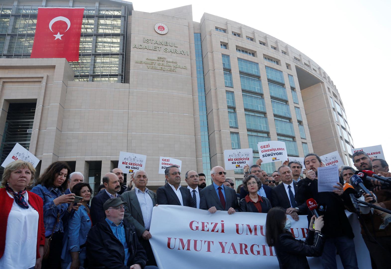 Lawyers, opposition lawmakers and supporters gather in front of the Justice Palace, the Caglayan Courthouse, as a Turkish court holds a hearing of philanthropist Osman Kavala and 15 others over their role in nationwide protests in 2013, in Istanbul, Turkey April 25, 2022. The banner reads: "Gezi is hope. Hope cannot be judged" REUTERS/Dilara Senkaya Photo: DILARA SENKAYA/REUTERS