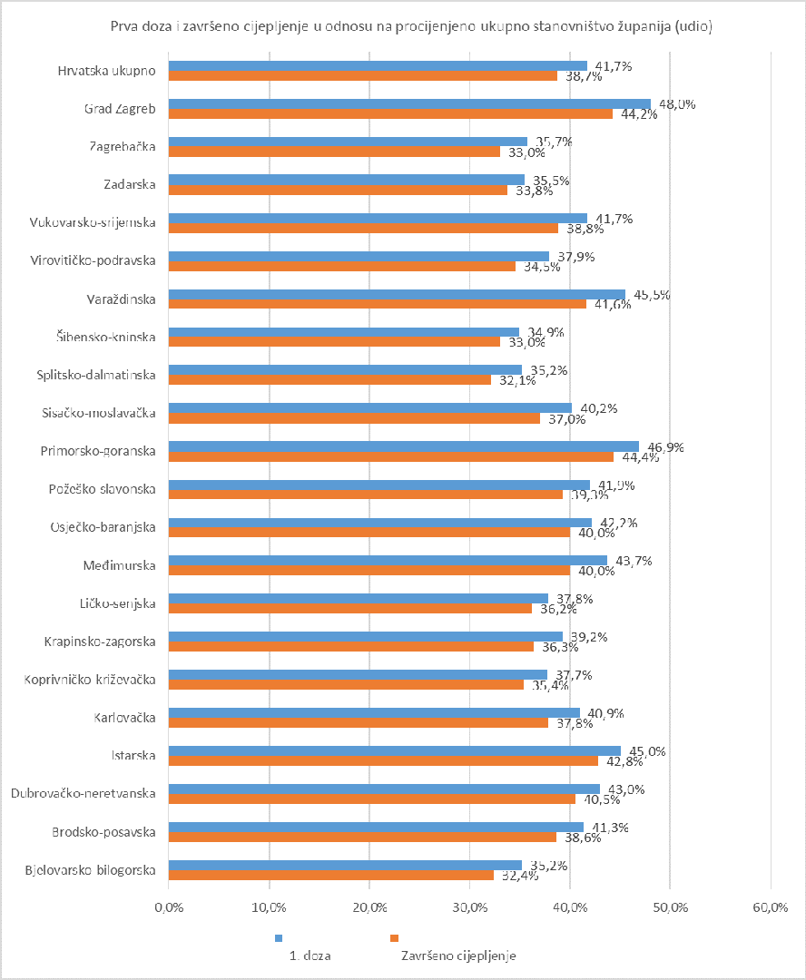 Najveći obuhvat cijepljenih prvom dozom postignut je u Gradu Zagrebu (48,0% ukupnog stanovništva, odnosno 58,0% odraslog stanovništva), a završeno cijepljenje u najvećem je obuhvatu ostvareno također u Gradu Zagrebu (44,2% ukupnog, odnosno 53,5% odraslog stanovništva).