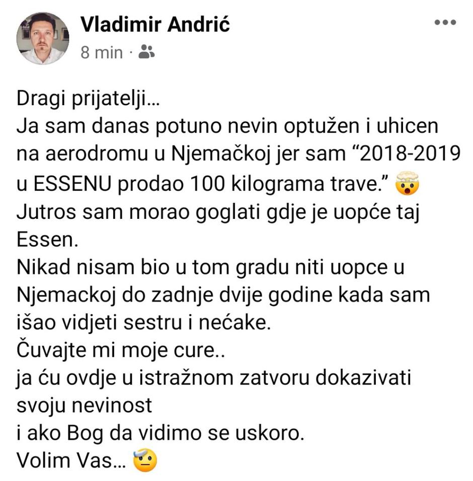 „Dragi prijatelji… Ja sam danas potpuno nevin optužen i uhićen na aerodromu u Njemačkoj jer sam 2018-2019 u Essenu prodao 100 kilograma trave. Jutros sam morao goglati gdje je uopće taj Essen. Nikad nisam bio u tom gradu niti uopće u Njemačkoj do zadnje dvije godine kada sam išao vidjeti sestru i nećake. Čuvajte mi moje cure… Ja ću ovdje u istražnom zatvoru dokazivati svoju nevinost i ako Bog da vidimo se uskoro. Volim vas…“, stoji u objavi Andrića na Facebooku.