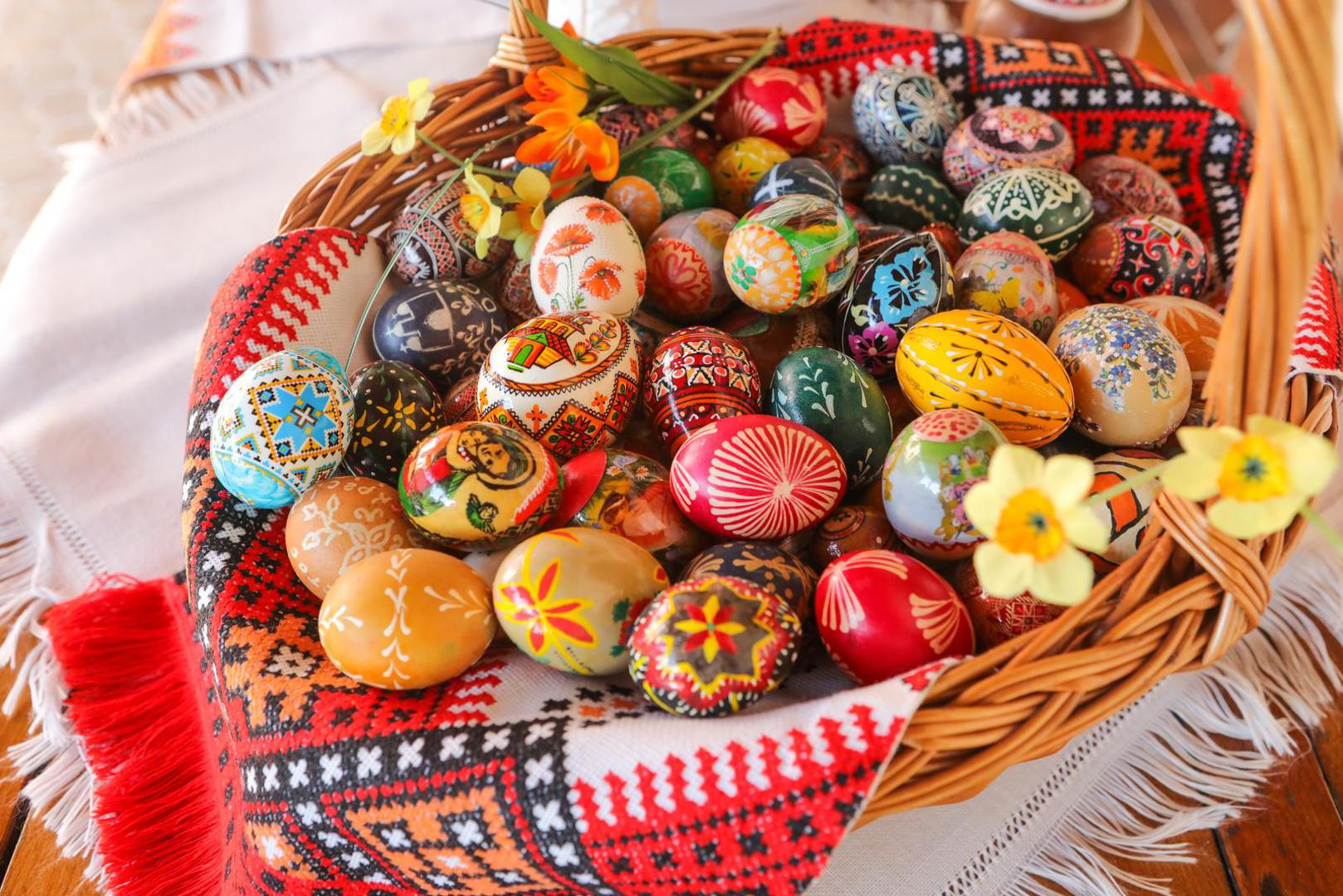 Uz pashu, na blagoslov jela u košarici se nose i šunka, kobasica, kuhana jaja – kako pisanice tako i ona očišćena od ljuske, sir, hren, mladi luk... Ukrajina je posebno bogata po običajima ukrašavanja pisanica, a svaka oblast ima svoje motive i način šaranja uskrsnih jaja. Punu košaru pravih umjetničkih remek-djela pokazuje nam časna sestra Anastasija Pitka, godinama su ih skupljali u župi, a Svetlana uzima jaje po jaje i znalački nam govori kojem kraju pripada. Cvjetni su motivi tipični za zapad zemlje. Križ na pisanici, pak, označava cjelinu svijeta.