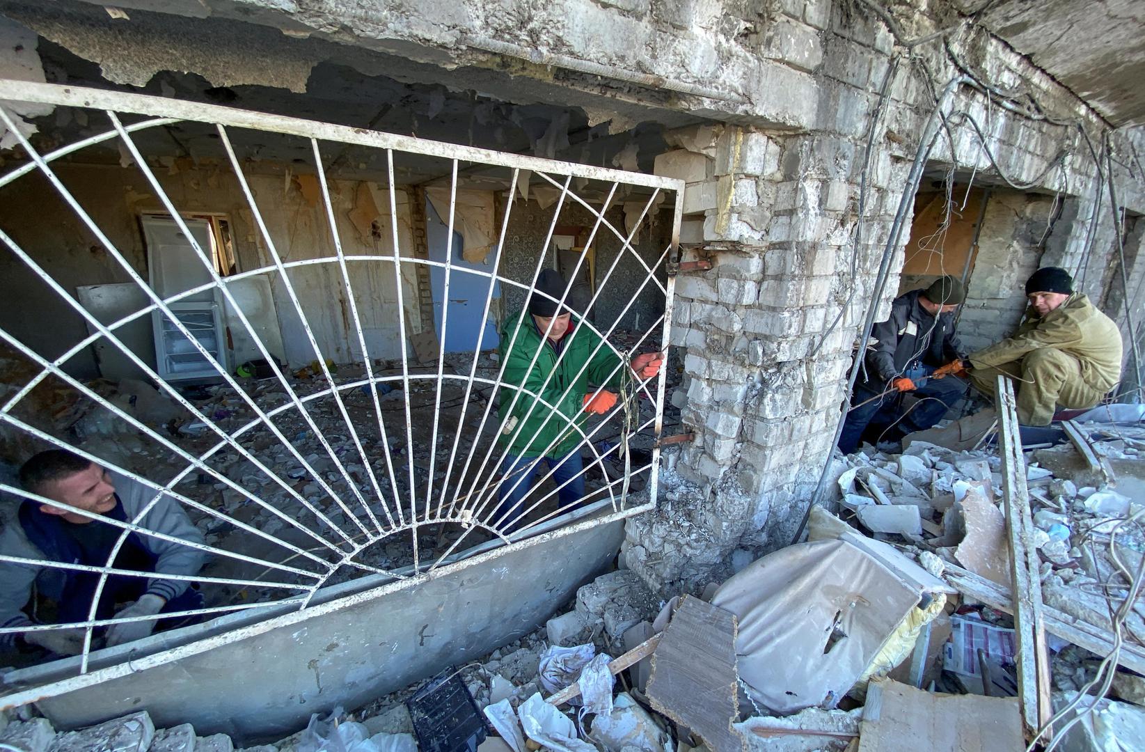 Municipal workers and volunteers remove debris of a damaged residential building, as Russia's attack on Ukraine continues, in Kharkiv, Ukraine March 21, 2022. REUTERS/Vitalii Hnidyi Photo: Stringer/REUTERS