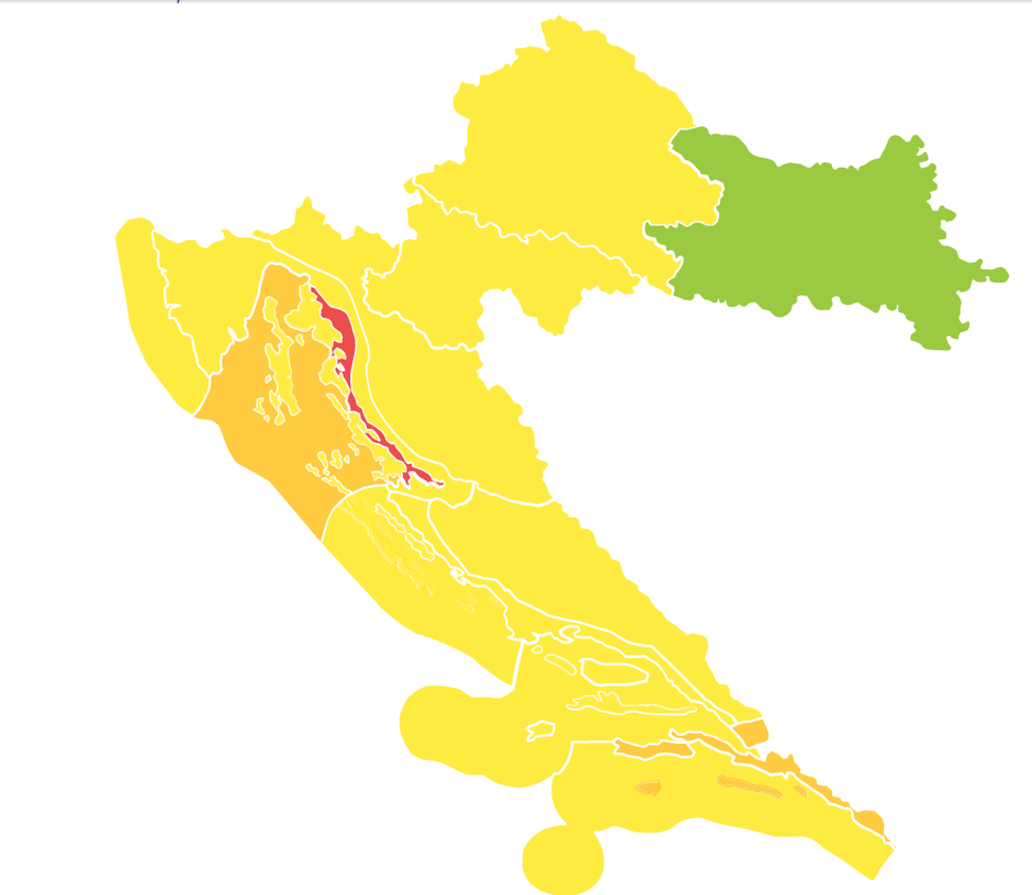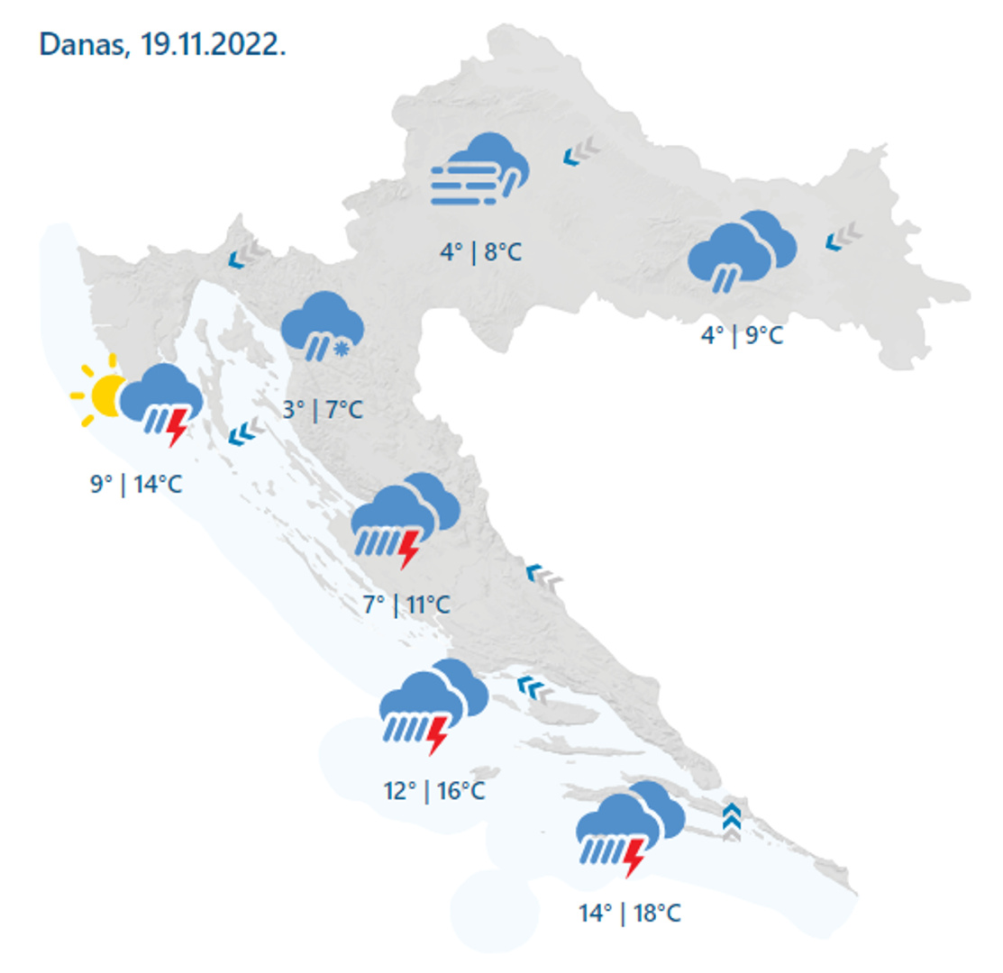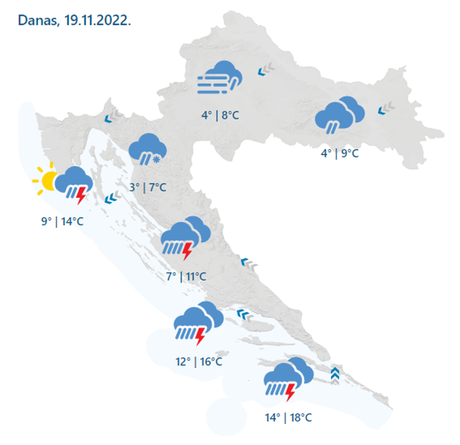 Poslijepodne i navečer u Dalmaciji ponegdje obilna oborina, lokalno praćena grmljavinom. U gorju će u noći uz zahladnjenje kiša prijeći u snijeg, a susnježice može biti i u nizinama na zapadu zemlje.