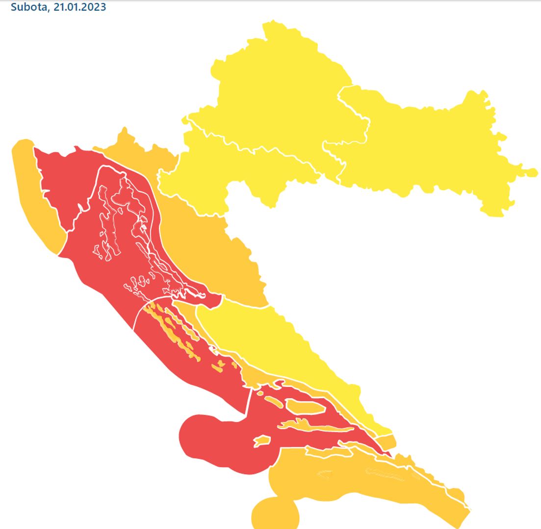 Državni hidrometeorološki zavod (DHMZ) objavio je za subotu, 21 siječnja, crveni meteoalarm za područje cijele jadranske obale. Upaljeni crveni meteoalarm sugerira izrazito opasno vrijeme, pojašnjava DHMZ, te ističe kako je crveni meteoalarm na snazi za subotu na području Rijeke, Kvarnera i Kvarnerića, Velebitskog kanala te srednje i sjeverne Dalmacije.