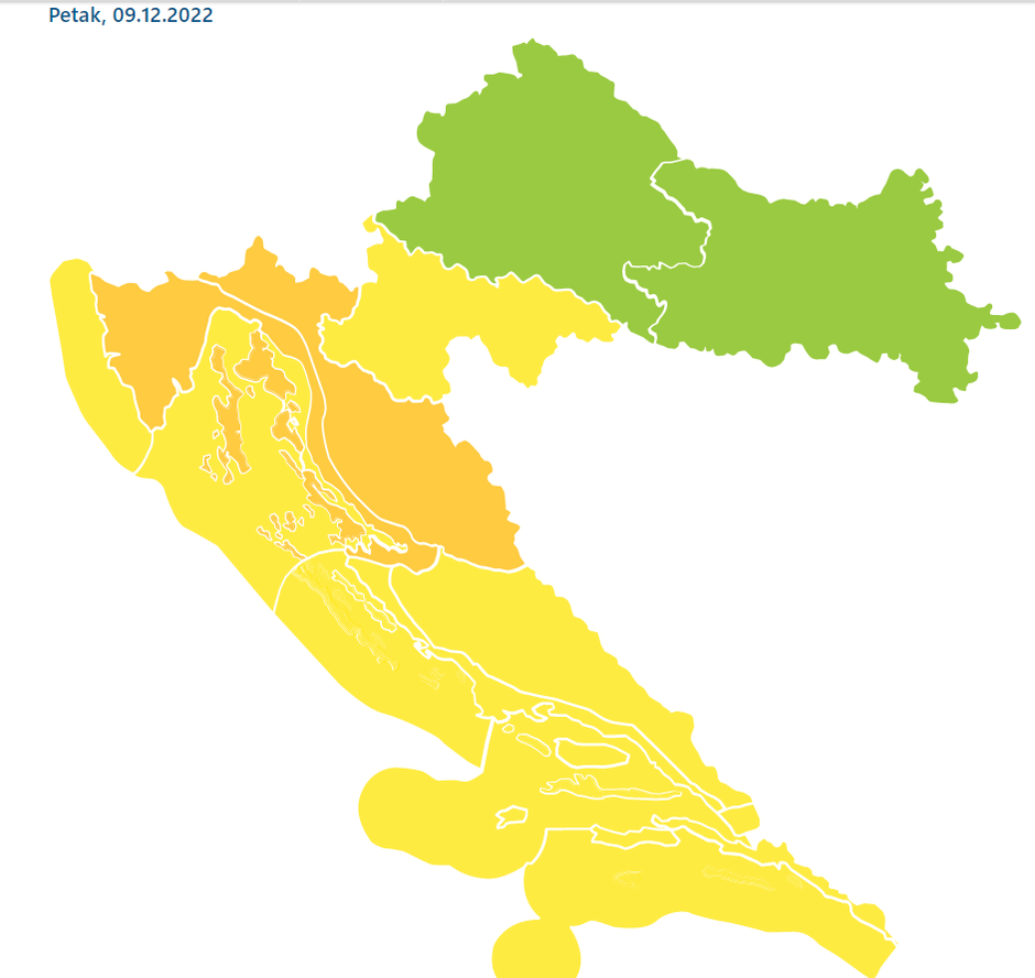 Tijekom jutra i prijepodneva u petak se nastavlja intenzivna i obilna oborinska epizoda na predjelu sjevernog Jadrana, širem području Rijeke i Gorskom kotaru. Kasnije tijekom petka intenzivna i obilna oborina može se očekivati na području gotovo cijelog Jadrana, njegovog zaleđa, Gorskog kotara i Like, što posljedično može izazvati lokalne urbane i bujične poplave, te poplavljivanja krških polja na tim područjima.