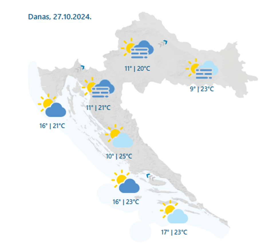 Na Jadranu će se većinom zadržati sunčano vrijeme, osobito u Dalmaciji, dok se na sjevernom Jadranu mjestimice očekuju niski oblaci i jutarnja magla. Danju će biti ugodno toplo uz povremeni umjeren sjeverozapadnjak, dok će uz obalu puhati bura. U unutrašnjosti Hrvatske u prvom dijelu dana često će se pojavljivati magla i niska naoblaka, koja bi od utorka mogla biti dugotrajna, u pojedinim mjestima i cjelodnevna, uz mogućnost rosulje. Temperatura će ostati iznadprosječna, ali će ovisiti o trajanju magle.