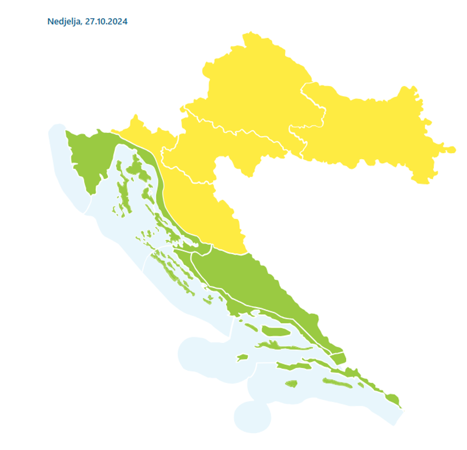 Zbog magle upaljeni su meteoalarmi za potencijalno opasno vrijeme u osječkoj, zagrebačkoj, karlovačkoj i gospićkoj regiji. Nedjeljno jutro u istočnim dijelovima Hrvatske bit će obilježeno maglom, osobito u Posavini gdje se očekuje značajno smanjena vidljivost. Vozačima se savjetuje oprez u prometu. Magla će se tijekom prijepodneva razilaziti, a od sredine dana prevladavat će sunčano i iznadprosječno toplo vrijeme s temperaturama do 23 °C.