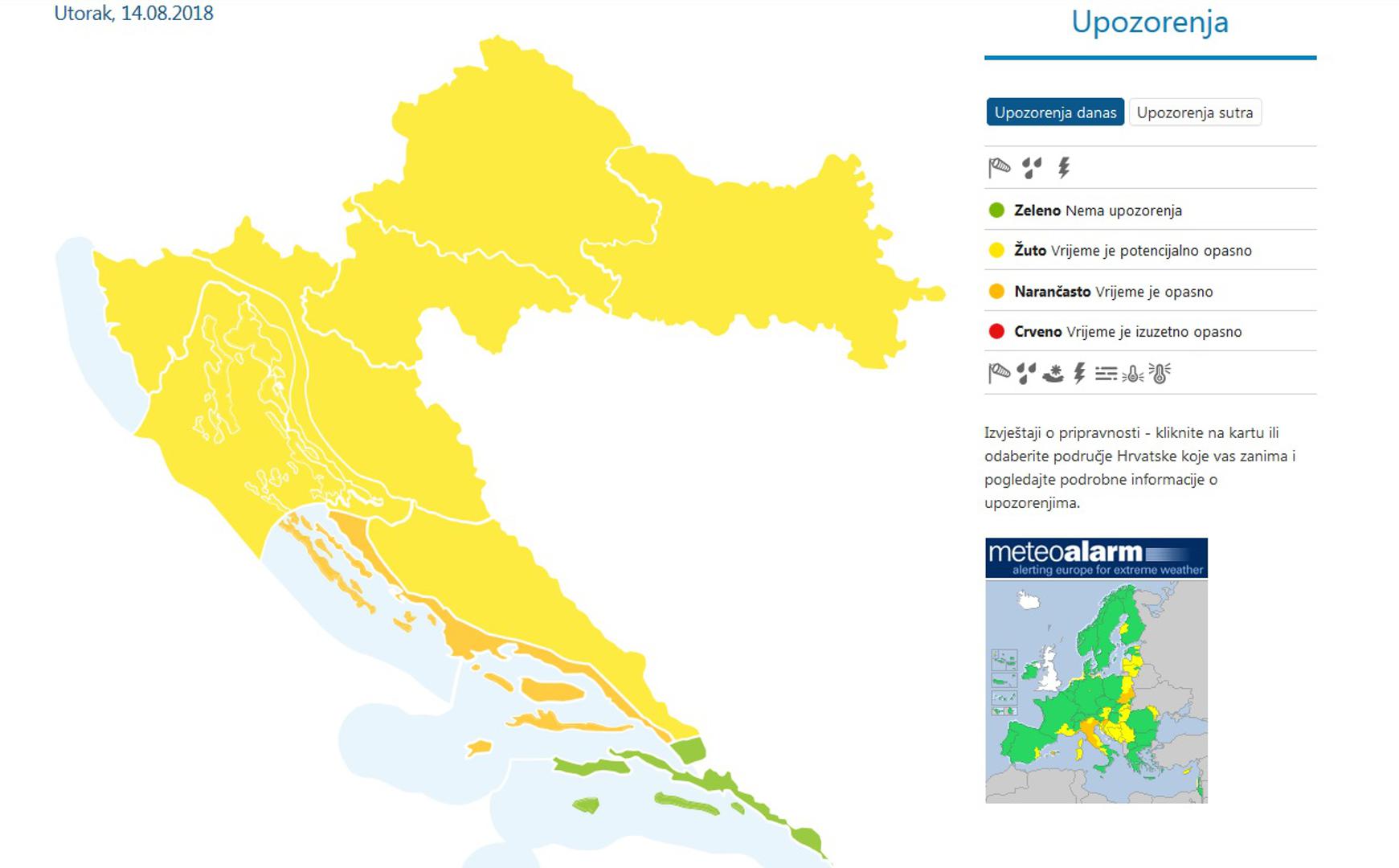 Upozorenja nema jedino za dubrovačku regiju gdje se očekuje sunčano vrijeme s temperaturama do 32 stupnja Celzijeva.