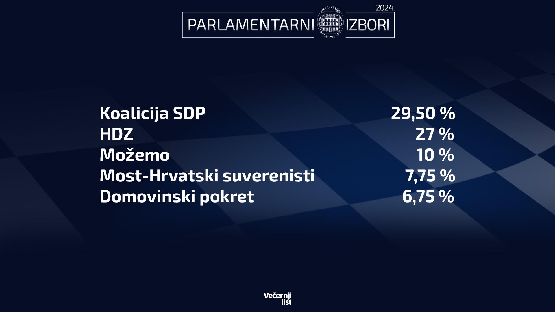 Parlamentarni izbori u Hrvatskoj održat će se 17. travnja ove godine. Prema istraživanju, ostane li situacija ista, podjela po mandatima bila bi sljedeća: SDP-ovoj koaliciji i HDZ-u po pet saborskih mandata, Možemo! dva mandata (jedan siguran, jedan bi mogao otići SDP-u), koaliciji Most – Hrvatski suverenisti i Domovinski pokret po jedan mandat.
