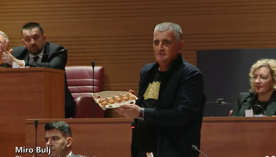 11:05 - Miro Bulj je dignuo jaja u zrak i kritizirao cijene. - Cijena jaja je porasla za 57 posto, a mirovine su porasle za 7 posto - izjavio je te je zatražio pauzu, koja mu je odobrena.