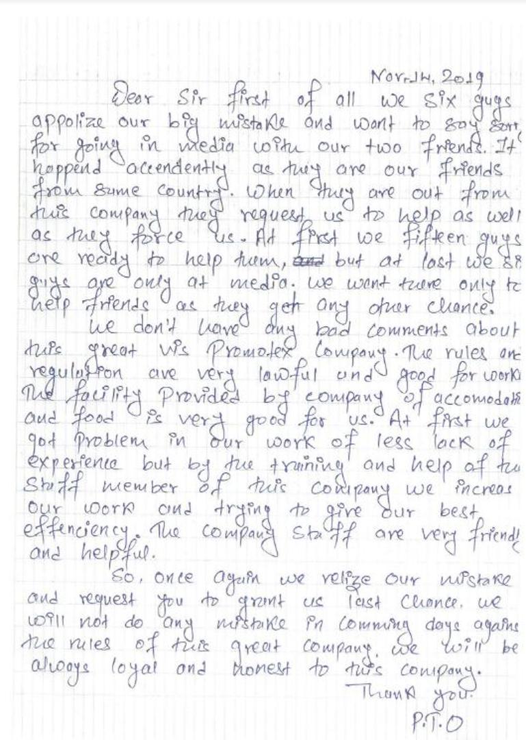 Nažalost, bili smo prisiljeni s dvojicom zaposlenika, Tamangom Hirabahadurom i Tamangom Kunchangom, koji su cijelo vrijeme svog boravka kod nas radili najveće probleme, sporazumno raskinuti ugovor o radu. Ne možemo zbog drugih 209 radnika dozvoliti da pojedinci sramote poslodavca, na način da se čak fizički obračunavaju u proizvodnji, i to pred ostalim radnicima od koji je gotovo 70 posto žena. One su bile zabrinute za svoju sigurnost zbog agresivnih pojedinaca, koji su takvo svoje ponašanje čak opisali u dnevnom izvještaju o radu!