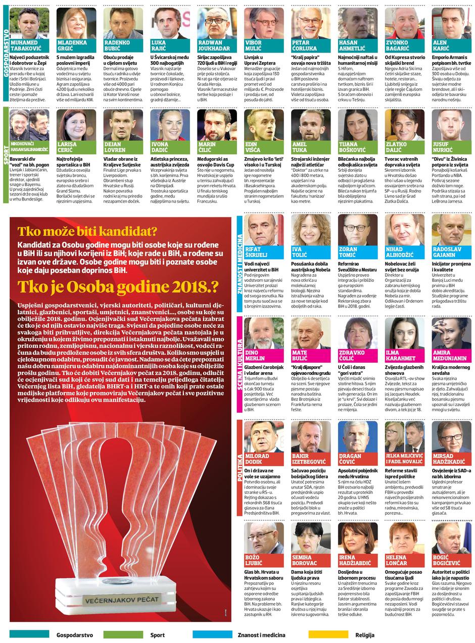 Cijenjeni čitatelji, pred sobom imate popis onih koji su, po izboru direkcije i ocjenjivačkog suda Večernjakova pečata, obilježili godinu iza nas. Političari, gospodarstvenici, crkveni velikodostojnici, sportaši, liječnici, glumci, humanisti, pjevači, filmski djelatnici..., njih 150 koji su ostavili dubok trag, našli su svoje mjesto na popisu kandidata za Osobu godine za 2018. U rubrici “Ponos BiH” nalazi se 50 “malih ljudi” velikih djela, onih koji su se istaknuli humano- šću te ostvarili pothvat ili uspjeh u prošloj godini. Među nagradama u različitim kategorijama koje ćemo dodijeliti bit će i ona “glavna” - za Osobu godine. Gosti Večernjakova pečata, ali i višemilijunski auditorij pred malim ekranima, moći će uživati i u spektakularnom kulturno-zabavnom programu. Suorganizator Pečata je BHRT, a medijski pokrovitelj HRT.