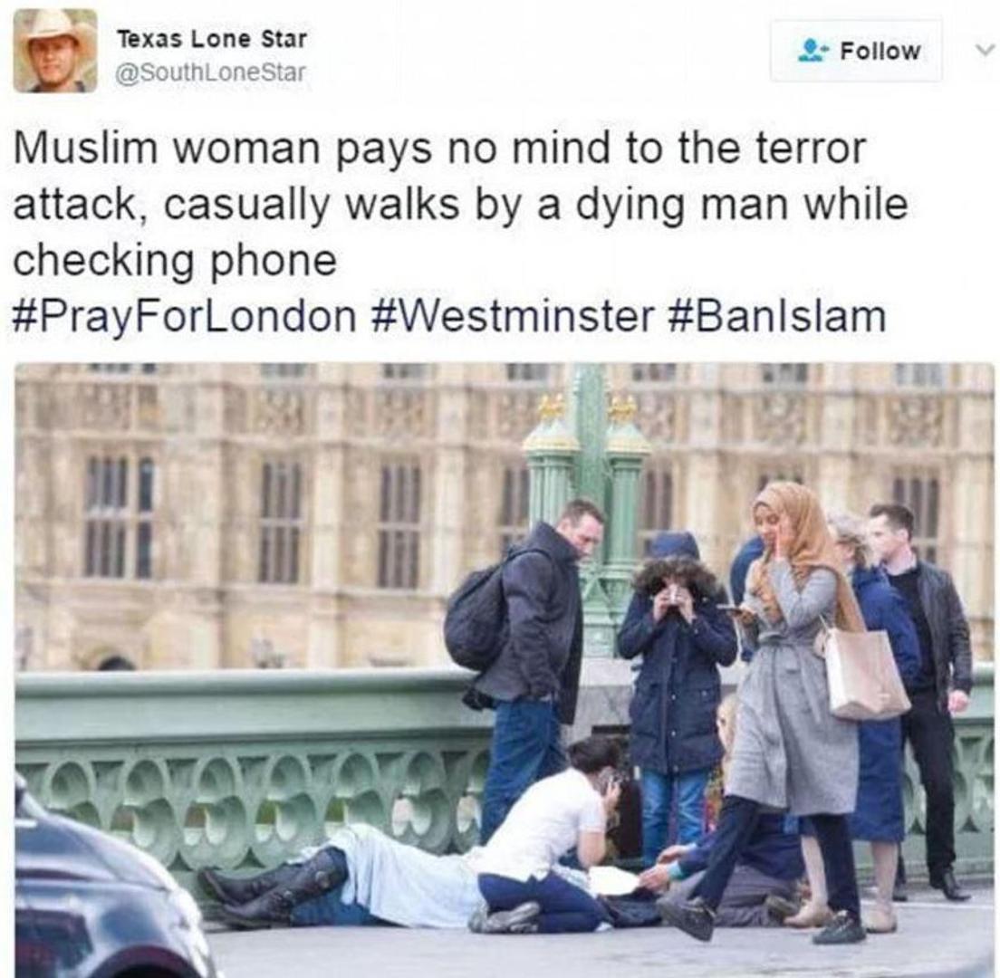 – Muslimanku je baš briga za teroristički napad, mirno šeće pokraj umirućeg muškarca i provjerava telefon – stajalo je na Twitteru uz fotografiju dramatične scene iz Londona nedugo nakon napada.
