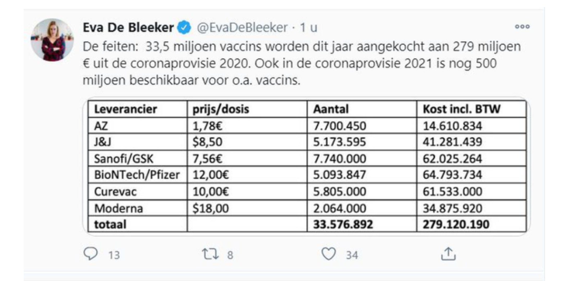 Tvit koji je De Bleeker objavila bio je odgovor na kritike iz oporbene parlamentarne grupe koja je navodila kako nema novca u državnom proračunu za kupnju cjepiva. Kabinet državne tajnice istaknuo je da je tablica objavljena zbog želje za transparentnošću, no kako je objava te informacija protivna ugovorima koje je potpisala Europska komisija.