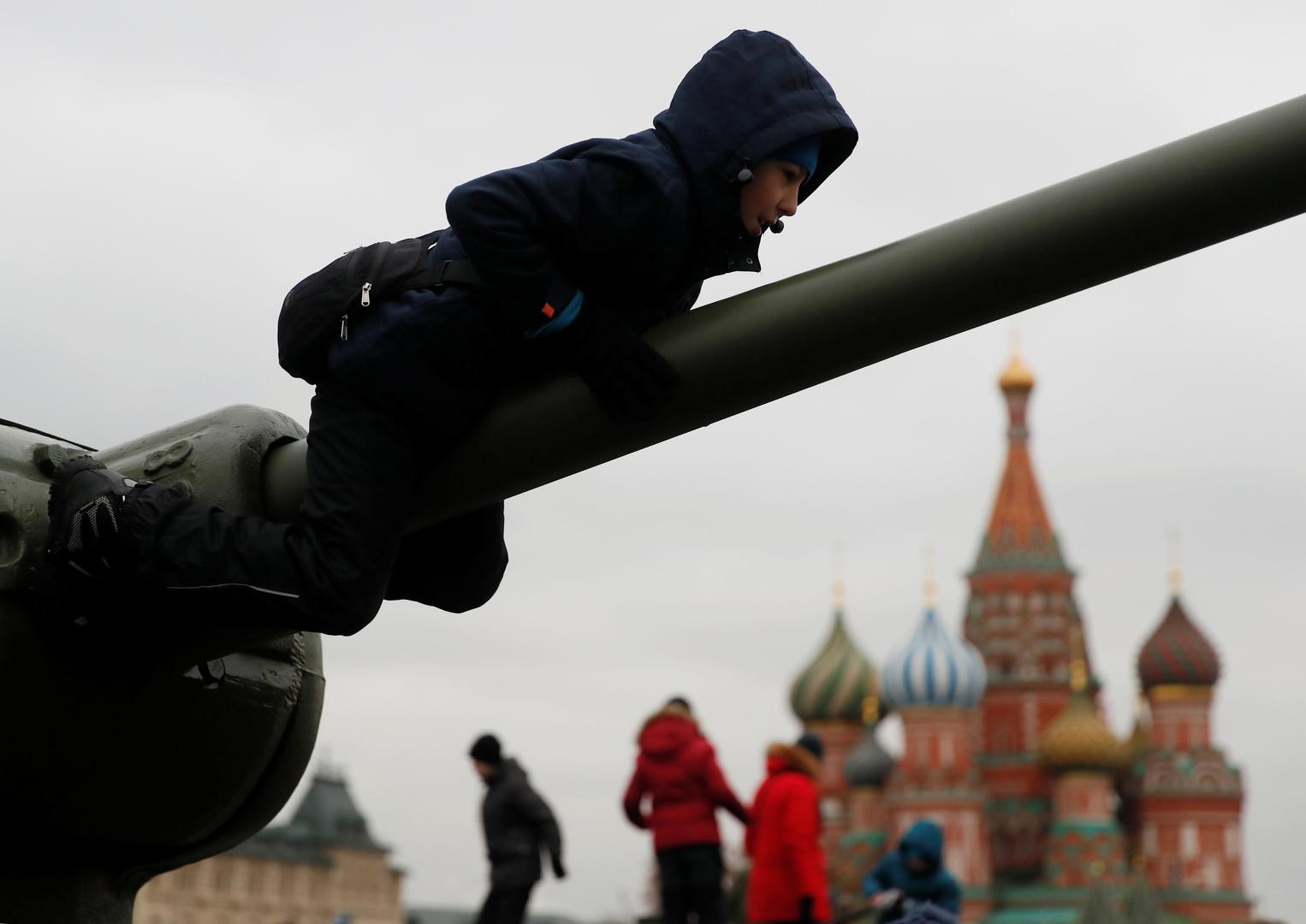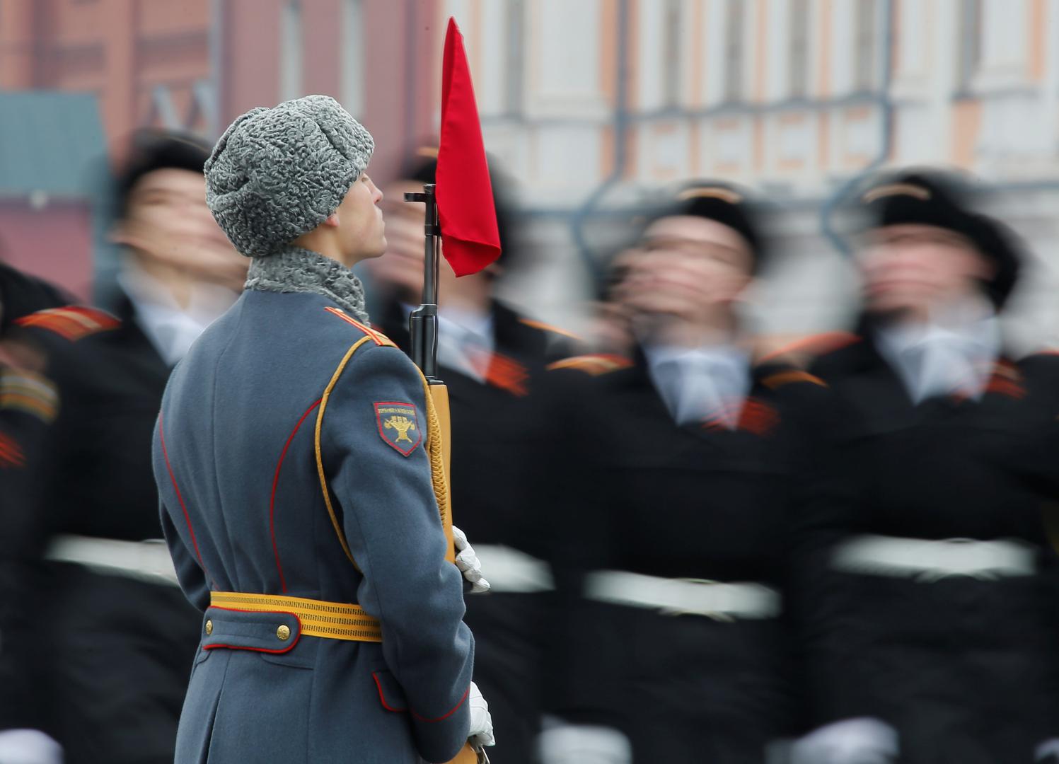 Parada se održava na Crvenom trgu, a vojnici su obučeni u uniforme iz Drugog svjetskog rata.