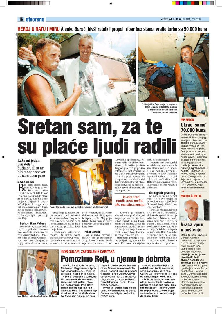 „Bio sam sretan kada sam čuo da je u torbi, koju sam našao i vratio, bilo 50.000 kuna. Bile su to plaće za koje su ljudi radili. Prijatelj mi je rekao – 'Hej, budalo!', ali ja ne bih mogao spavati da sam uzeo te pare“, rekao je tada 58-godišnji Barač-Roje, koji je te 2006. živio u lučici Spinut, u samo 8 kvadrata derutne kamp-prikolice, koja je prokišnjava te u njoj nije bilo ni struje, ni vode. No, bio je to godinama njegov jedini 'krov nad glavom', jer odrastao je u domu za nezbrinutu djecu i nikada nije ima vlastita četiri zida. Nakon školovanja, Roje je bio prepušten sam sebi, snalazio se kako je znao i umio, za život je zarađivao i radeći u Jugoplastici. Kada je počeo rat, bio je među prvima koji su otišli na front. Obišao je sva ratišta, pet je godina proveo na bojišnici, no kada je rat završio, opet je bio nigdje i ničiji. Tada je počela njegova druga, teška bitka – ona za opstanak. Borio se sam, ni od koga ništa nije želio tražiti, a nitko od onih koji su mu mogli i trebali pomoći nije ga se, onako spontano i ljudski, sam sjetio.