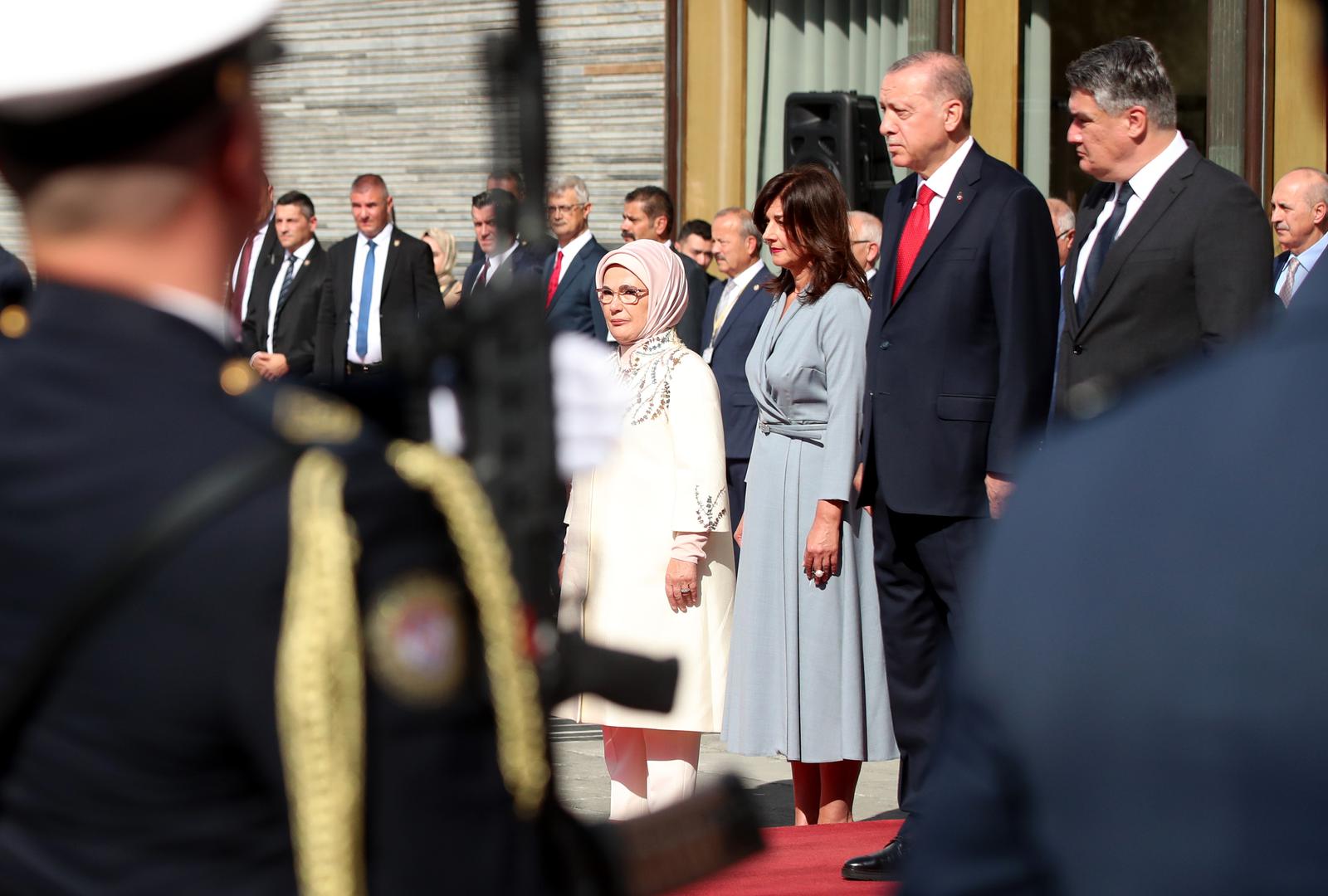 Turski predsjednik Recep Tayyip Erdogan u službenom je posjetu Hrvatskoj na poziv predsjednika Zorana MIlanovića, a jutros je prvo stigao na Pantovčak. Počasno-zaštitna bojna pozdravila je turskog čelnika u 10 sati, nakon čega su intonirane hrvatska i turska himna. Erdogan u Zagrebu završava regionalnu turneju koju je započeo u utorak posjetom Bosni i Hercegovini, gdje se sastao s članovima predsjedništva, dok se dan kasnije sastao s predsjednikom Srbije Aleksandrom Vučićem u Beogradu.