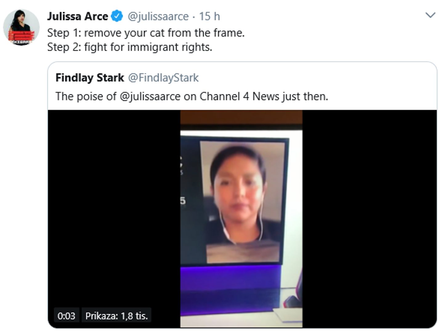 Gledatelji su brzo uočili takozvani camiaow i pohvalili Julissu na Twitteru, a sama je napisala upute po kojima "prvo trebate ukloniti mačku iz kadra, a onda se boriti za prava imigranata".