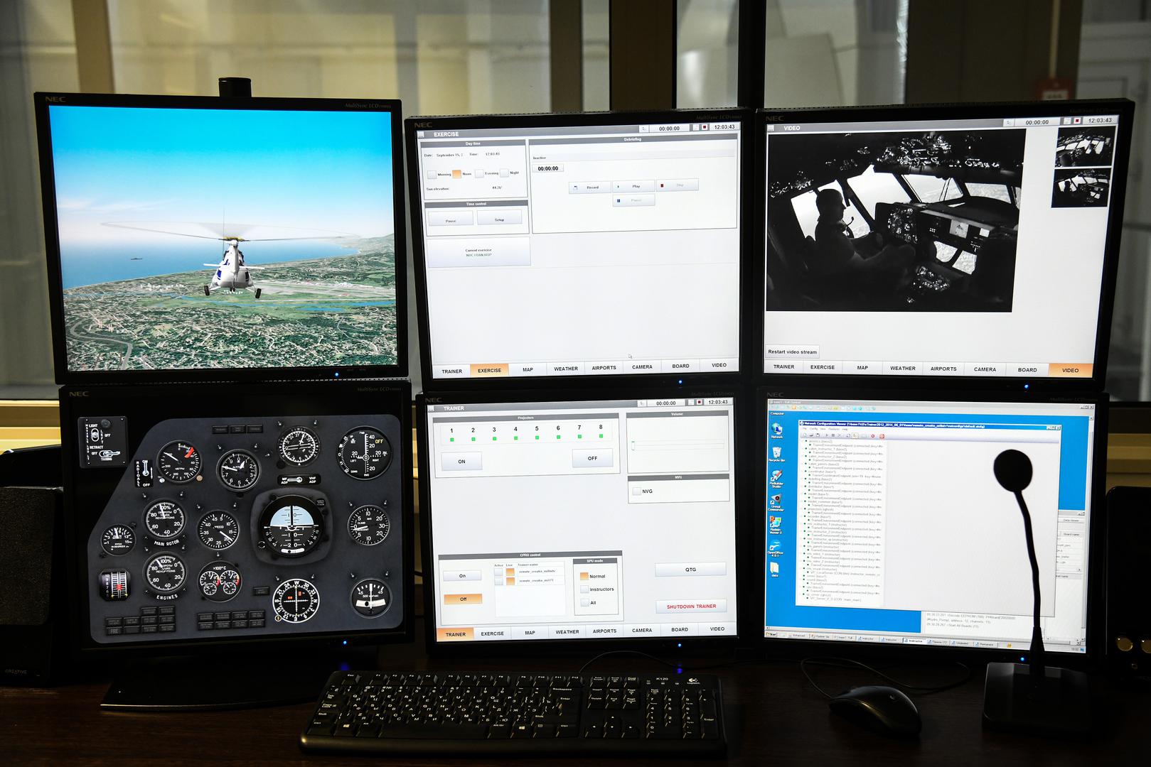 Uistinu je sve identično, napravljeno od istih materijala, samo se iza stakla ne nalazi pravi teren, nego je on projiciran na osam modernih zakrivljenih ekrana. Piloti mogu birati krajolik, ovisno o tome u kakvim uvjetima žele vježbati. Za let u pustinji je najpopularniji Afganistan, dok je let iznad Sočija najzahtjevniji jer kombinira kretanje iznad naseljenog grada, planina i mora. Mapa iznad koje se leti je prikazana do najsitnijih detalja, od, primjerice objekata u Olimpijskom selu do naftnih platforma na kojima se također vježba slijetanje. Iako je to dosta skupo, autentična mapa se može napraviti za bilo koji dio svijeta, ovisno o tome što vojske koje u Heli centru vježbaju žele.