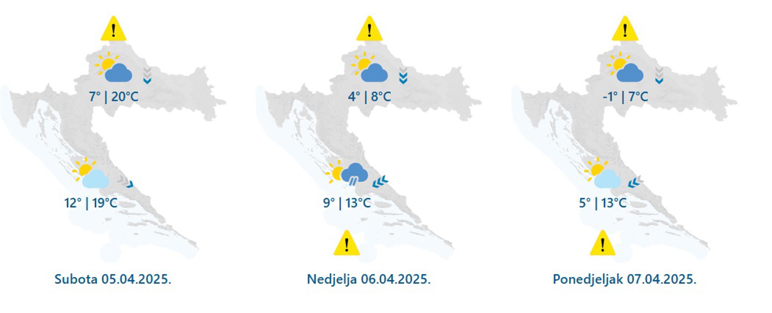 Nedjelja nam donosi promjenjivo, vjetrovito i osjetno hladnije vrijeme. Mjestimice kiša, uglavnom u Dalmaciji, a na kopnu i malo snijega, poslijepodne ponajprije na istoku i u obliku pljuskova. Puhat će umjeren i jak sjeverni i sjeveroistočni vjetar, na Jadranu jaka i olujna bura. U ponedjeljak na Jadranu pretežno sunčano, u unutrašnjosti uz lokalno više oblaka mogući su pljuskovi snijega. Vjetar mjestimice umjeren sjeverni, na Jadranu i dalje jaka, na udare olujna bura. Jutra hladnija pa je ponegdje na kopnu moguć slab mraz.