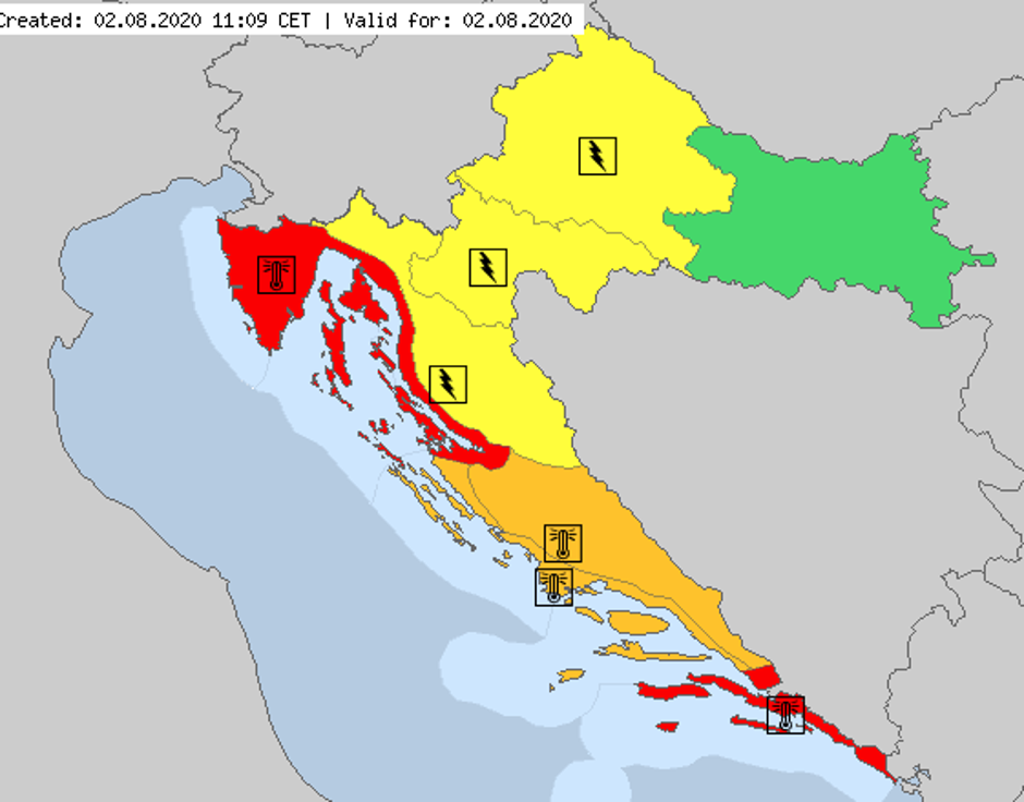 Meteoalarm je za danas proglasio crveni alarm za područje Dubrovnika kao i Rijeke, dok je narančasto upozorenje proglašeno za područje Splitsko-dalmatinske županije.